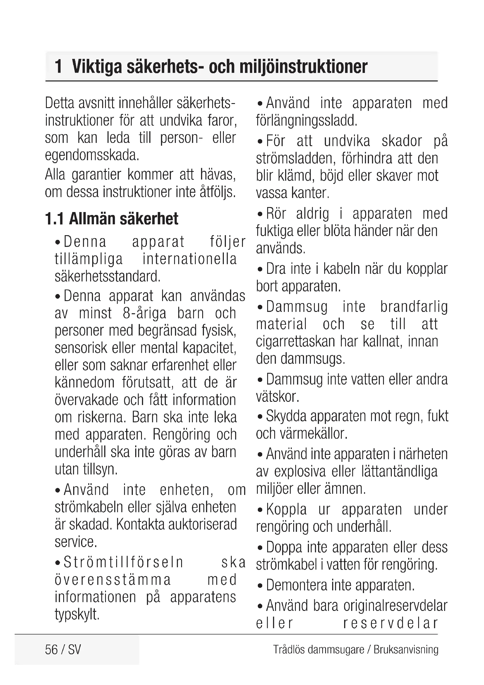 - Dersom apparatet mistes i gulvet, kan det hende at apparatet ikke fungerer, eller det kan oppstå permanente skader.56 / SV Trådlös dammsugare / Bruksanvisning Detta avsnitt innehåller säkerhets- instruktioner för att undvika faror, som kan leda till person- eller egendomsskada. Alla garantier kommer att hävas, om dessa instruktioner inte åtföljs.
