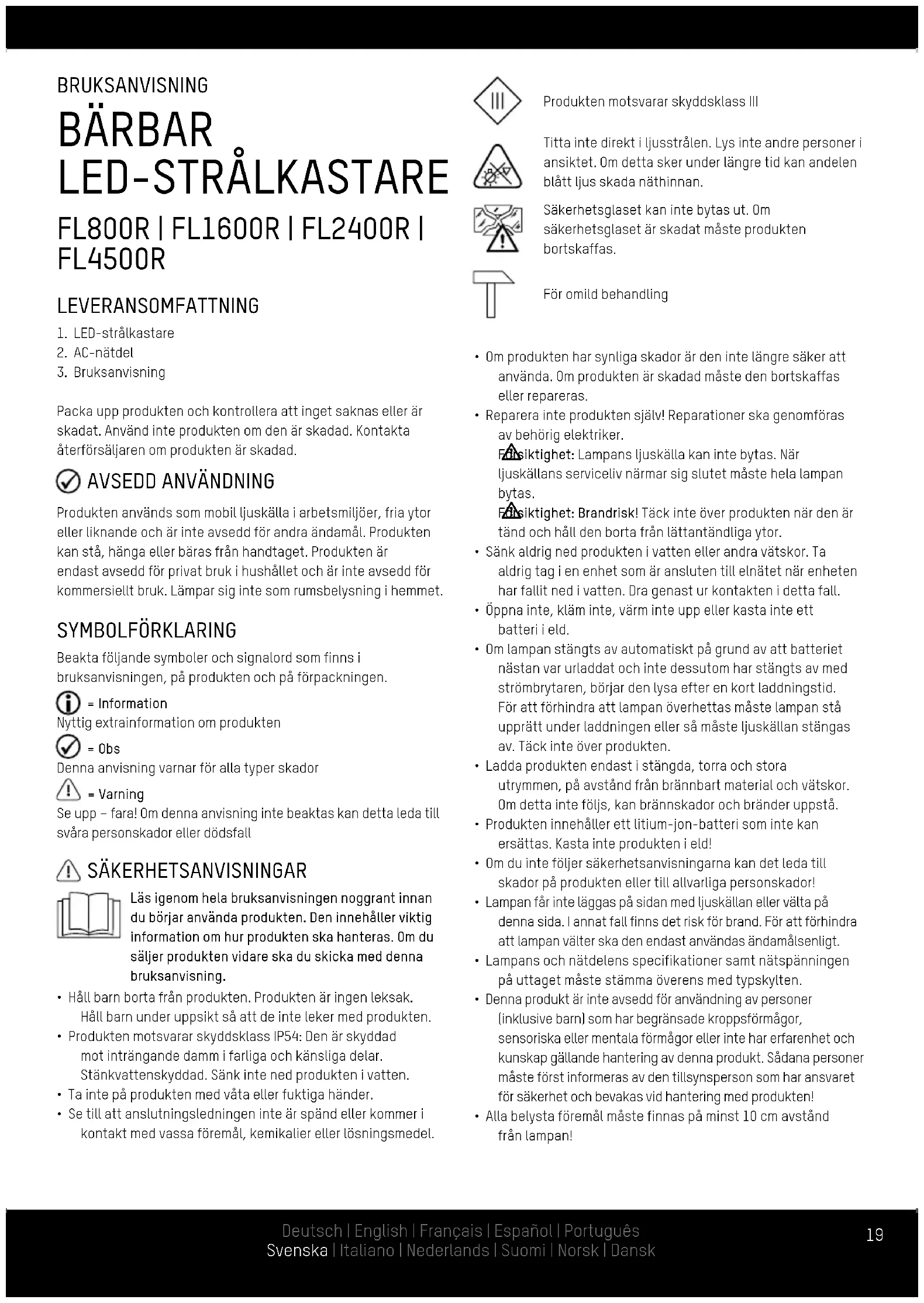 Produkten används som mobil ljuskälla i arbetsmiljöer, fria ytor eller liknande och är inte avsedd för andra ändamål. Produkten kan stå, hänga eller bäras från handtaget. Produkten är endast avsedd för privat bruk i hushållet och är inte avsedd för kommersiellt bruk. Lämpar sig inte som rumsbelysning i hemmet. SYMBOLFÖRKLARING Beakta följande symboler och signalord som finns i bruksanvisningen, på produkten och på förpackningen. = Information Nyttig extrainformation om produkten = Obs Denna anvisning varnar för alla typer skador = Varning Se upp – fara! Om denna anvisning inte beaktas kan detta leda till svåra personskador eller dödsfall SÄKERHETSANVISNINGAR Läs igenom hela bruksanvisningen noggrant innan du börjar använda produkten. Den innehåller viktig information om hur produkten ska hanteras. Om du säljer produkten vidare ska du skicka med denna bruksanvisning.