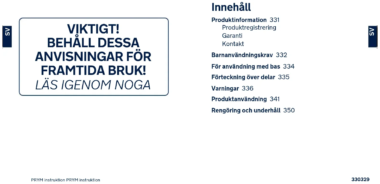 Innehåll Produktinformation 331 Produktregistrering Garanti Kontakt Barnanvändningskrav 332 För användning med bas 334 Förteckning över delar 335 Varningar 336 Produktanvändning 341 Rengöring och underhåll 350332331 PRYM instruktion PRYM instruktion