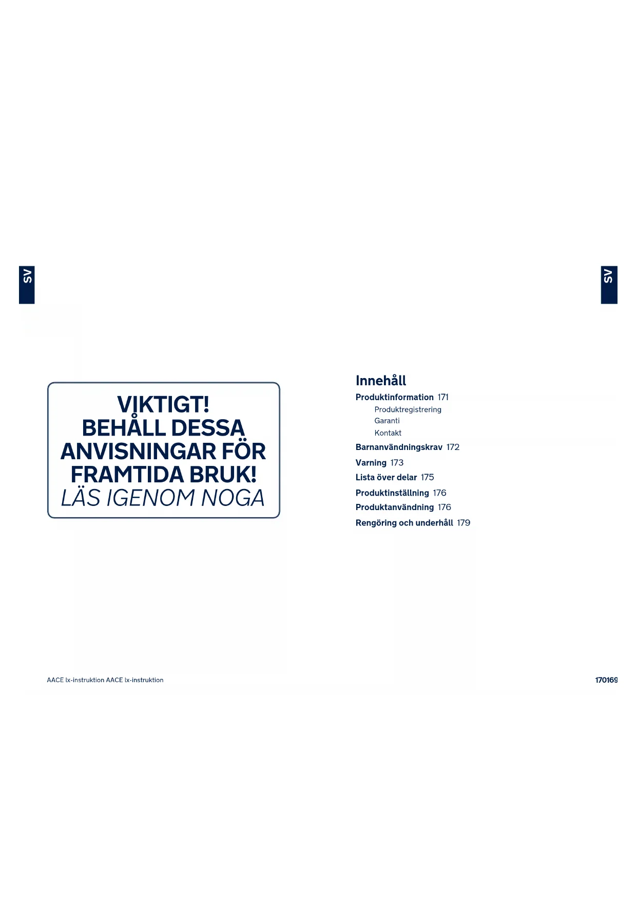 Instruksjoner for AACE lx Instruksjoner for AACE lxInnehåll Produktinformation 171 Produktregistrering Garanti Kontakt Barnanvändningskrav 172 Varning 173 Lista över delar 175 Produktinställning 176 Produktanvändning 176 Rengöring och underhåll 179 VIKTIGT!