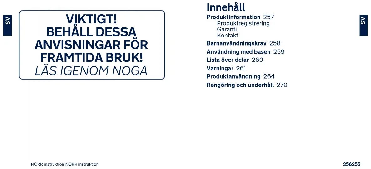 SVProduktinformation Modellnummer: ______________________________________________________________________________________________________________ Tillverkningsdatum: __________________________________________________________________________________________________ Produktregistrering Fyll i ovanstående information. Modellnumret och tillverkningsdatum är placerade under NORR. Registrera din produkt genom att besöka: www.nunababy.com Klicka på länken “Registrera utrustning” på webbplatsen. Garanti Vi har avsiktligt designat våra högkvalitativa produkter så att de kan växa med både barnet och familjen. Eftersom vi står för våra produkter täcks vår utrustning av en kundgaranti per produkt med början från inköpsdatumet. Ha inköpsbevis, modellnummer och tillverkningsdatum tillgängligt när du kontaktar oss. För garantiinformation besök: www.nunababy.com Klicka på länken “Garanti” på startsidan. Kontakt För reservdelar, service eller ytterligare garantifrågor, kontakta vår kundtjänstavdelning. info@nunababy.com www.nunababy.com Barnanvändningskrav Denna produkt är lämplig att använda för barn som uppfyller följande krav: Bakåtvänd: Barnets längd 40cm–105cm/barnets vikt≤18 kg Installationsläge Montering Lutnings-positionSpädbarns- läge 1-7 Barnets längd 40 cm- 105cm / barnets vikt ≤18kg