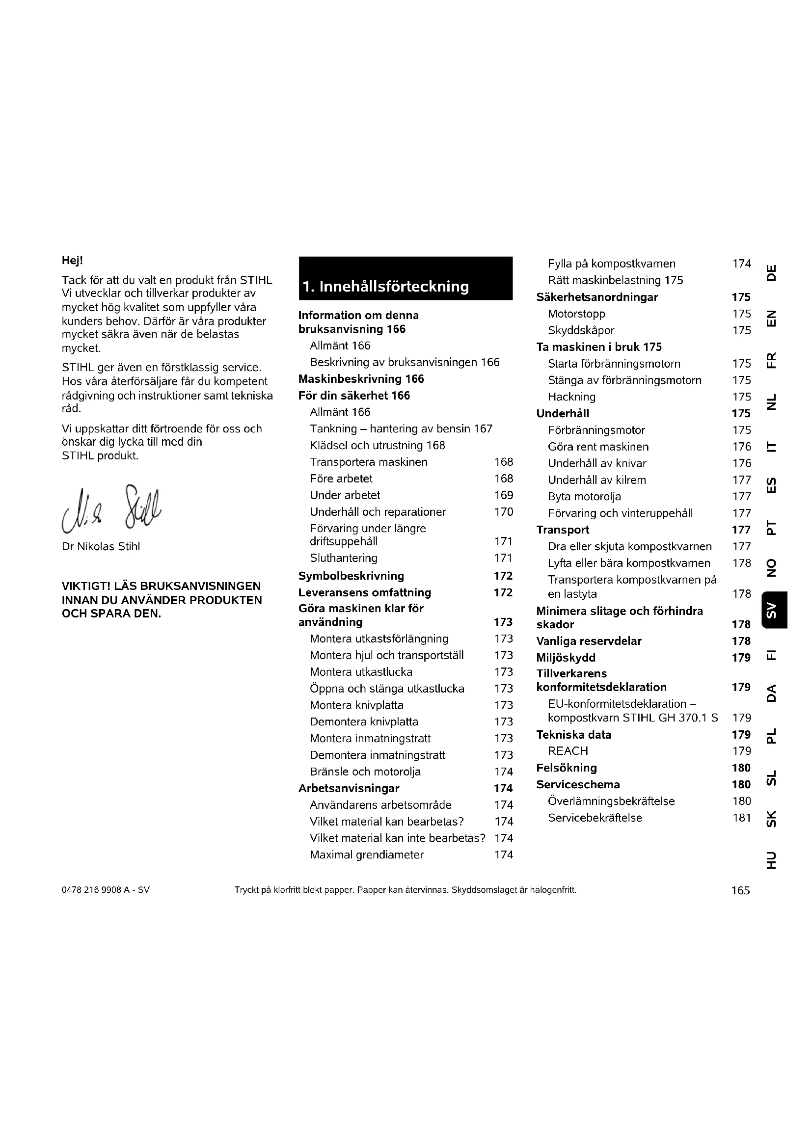 Information om denna bruksanvisning 166 Allmänt 166 Beskrivning av bruksanvisningen 166 Maskinbeskrivning 166 För din säkerhet 166 Allmänt 166 Tankning – hantering av bensin 167 Klädsel och utrustning 168 Transportera maskinen 168 Före arbetet 168 Under arbetet 169 Underhåll och reparationer 170 Förvaring under längre driftsuppehåll 171 Sluthantering 171 Symbolbeskrivning 172 Leveransens omfattning 172 Göra maskinen klar för användning 173 Montera utkastsförlängning 173 Montera hjul och transportställ 173 Montera utkastlucka 173 Öppna och stänga utkastlucka 173 Montera knivplatta 173 Demontera knivplatta 173 Montera inmatningstratt 173 Demontera inmatningstratt 173 Bränsle och motorolja 174 Arbetsanvisningar 174 Användarens arbetsområde 174 Vilket material kan bearbetas? 174 Vilket material kan inte bearbetas? 174 Maximal grendiameter 174 Fylla på kompostkvarnen 174 Rätt maskinbelastning 175 Säkerhetsanordningar 175 Motorstopp 175 Skyddskåpor 175 Ta maskinen i bruk 175 Starta förbränningsmotorn 175 Stänga av förbränningsmotorn 175 Hackning 175 Underhåll 175 Förbränningsmotor 175 Göra rent maskinen 176 Underhåll av knivar 176 Underhåll av kilrem 177 Byta motorolja 177 Förvaring och vinteruppehåll 177 Transport 177 Dra eller skjuta kompostkvarnen 177 Lyfta eller bära kompostkvarnen 178 Transportera kompostkvarnen på en lastyta 178 Minimera slitage och förhindra skador 178 Vanliga reservdelar 178 Miljöskydd 179 Tillverkarens konformitetsdeklaration 179 EU-konformitetsdeklaration – kompostkvarn STIHL GH 370.1 S 179 Tekniska data 179 REACH 179 Felsökning 180 Serviceschema 180 Överlämningsbekräftelse 180 Servicebekräftelse 1810478 216 9908 A - SV