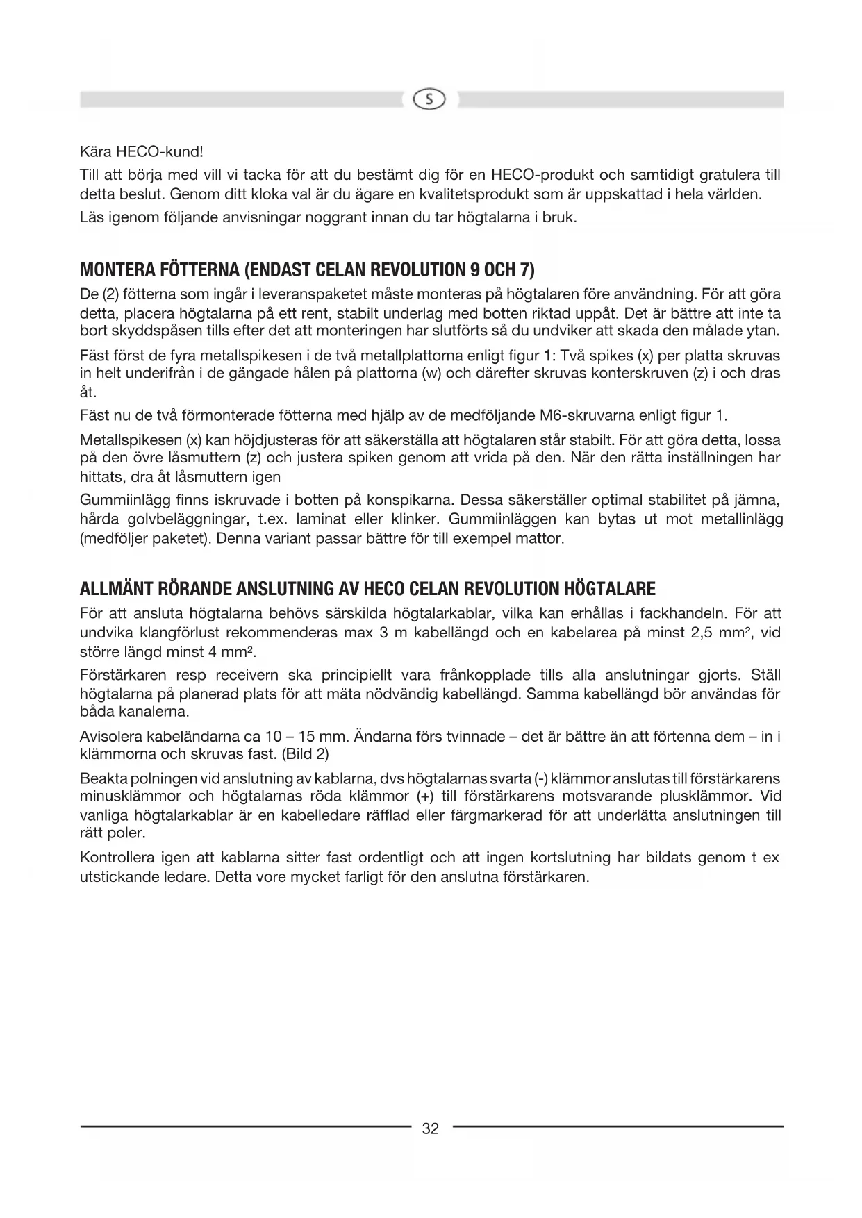 - Watt 30 Watt Rendimento (1 Watt/1 m): 90 dB 90 dB Dimensões (LxAxP): 240 x 420 x 360 mm 598 x 212 x 360 mm Acessórios: Pés de borracha endurecida Pés de borracha endurecida RESERVADOS OS DIREITOS DE ALTERAÇÕES TÉCNICAS.32 Kära HECO-kund! Till att börja med vill vi tacka för att du bestämt dig för en HECO-produkt och samtidigt gratulera till detta beslut. Genom ditt kloka val är du ägare en kvalitetsprodukt som är uppskattad i hela världen. Läs igenom följande anvisningar noggrant innan du tar högtalarna i bruk. MONTERA FÖTTERNA (ENDAST CELANREVOLUTION 9 OCH 7) De (2) fötterna som ingår i leveranspaketet måste monteras på högtalaren före användning. För att göra detta, placera högtalarna på ett rent, stabilt underlag med botten riktad uppåt. Det är bättre att inte ta bort skyddspåsen tills efter det att monteringen har slutförts så du undviker att skada den målade ytan. Fäst först de fyra metallspikesen i de två metallplattorna enligt gur 1: Två spikes (x) per platta skruvas in helt underifrån i de gängade hålen på plattorna (w) och därefter skruvas konterskruven (z) i och dras åt. Fäst nu de två förmonterade fötterna med hjälp av de medföljande M6-skruvarna enligt gur 1. Metallspikesen (x) kan höjdjusteras för att säkerställa att högtalaren står stabilt. För att göra detta, lossa på den övre låsmuttern (z) och justera spiken genom att vrida på den. När den rätta inställningen har hittats, dra åt låsmuttern igen Gummiinlägg nns iskruvade i botten på konspikarna. Dessa säkerställer optimal stabilitet på jämna, hårda golvbeläggningar, t.ex. laminat eller klinker. Gummiinläggen kan bytas ut mot metallinlägg (medföljer paketet). Denna variant passar bättre för till exempel mattor. ALLMÄNT RÖRANDE ANSLUTNING AV HECO CELANREVOLUTION HÖGTALARE För att ansluta högtalarna behövs särskilda högtalarkablar, vilka kan erhållas i fackhandeln. För att undvika klangförlust rekommenderas max 3 m kabellängd och en kabelarea på minst 2,5 mm², vid större längd minst 4 mm². Förstärkaren resp receivern ska principiellt vara frånkopplade tills alla anslutningar gjorts. Ställ högtalarna på planerad plats för att mäta nödvändig kabellängd. Samma kabellängd bör användas för båda kanalerna. Avisolera kabeländarna ca 10 – 15 mm. Ändarna förs tvinnade – det är bättre än att förtenna dem – in i klämmorna och skruvas fast. (Bild 2) Beakta polningen vid anslutning av kablarna, dvs högtalarnas svarta (-) klämmor anslutas till förstärkarens minusklämmor och högtalarnas röda klämmor (+) till förstärkarens motsvarande plusklämmor. Vid vanliga högtalarkablar är en kabelledare räfad eller färgmarkerad för att underlätta anslutningen till rätt poler. Kontrollera igen att kablarna sitter fast ordentligt och att ingen kortslutning har bildats genom t ex utstickande ledare. Detta vore mycket farligt för den anslutna förstärkaren.33 p. 180