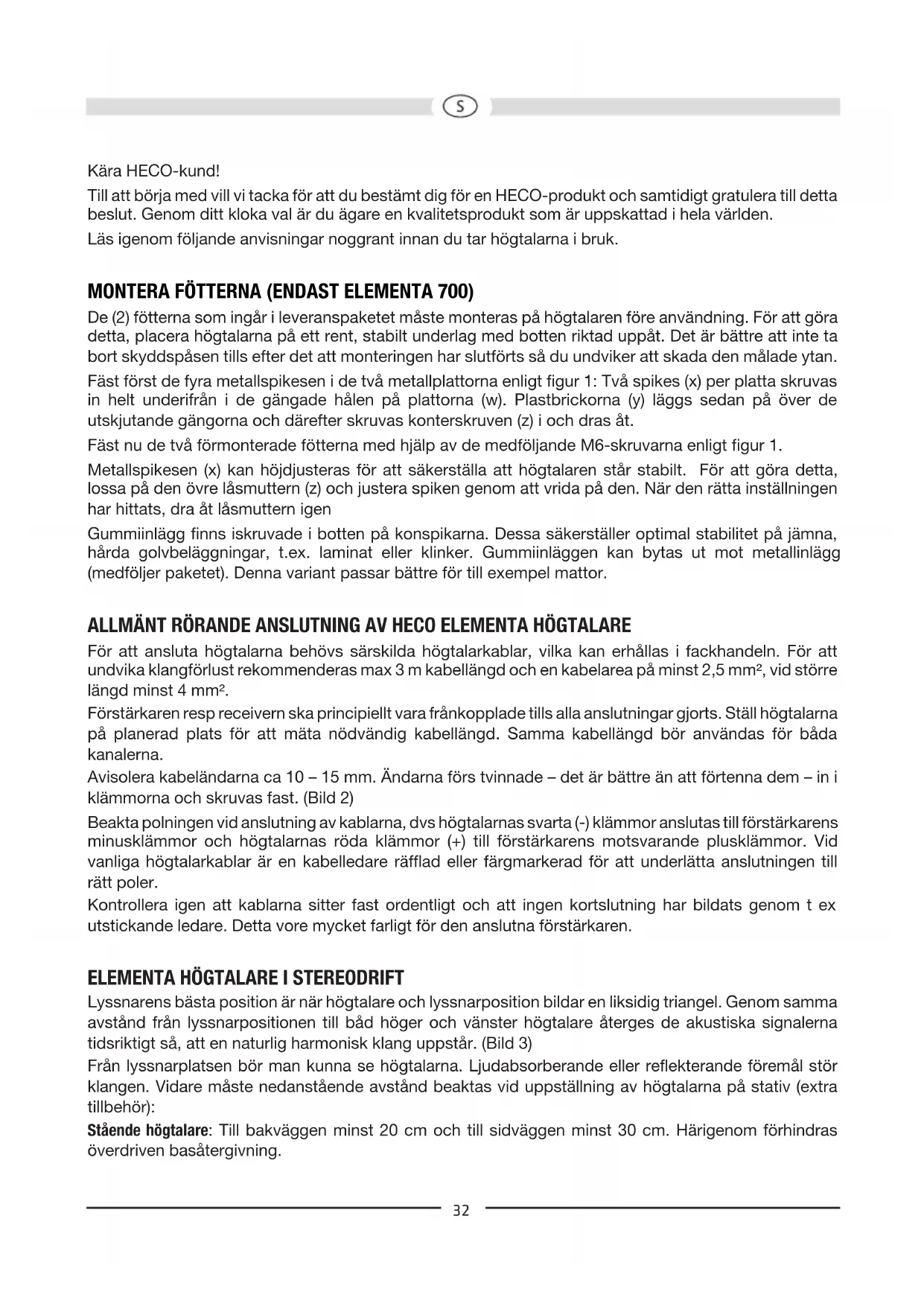 - 000 Hz Potência recomendada para o amplificador: 30 Watt Rendimento (1 Watt/1 m): 90 dB Dimensões (LxAxP): 510 x 178 x 278 mm Acessórios: Pés de borracha endurecida RESERVADOS OS DIREITOS DE ALTERAÇÕES TÉCNICAS.Kära HECO-kund! Till att börja med vill vi tacka för att du bestämt dig för en HECO-produkt och samtidigt gratulera till detta beslut. Genom ditt kloka val är du ägare en kvalitetsprodukt som är uppskattad i hela världen. Läs igenom följande anvisningar noggrant innan du tar högtalarna i bruk. MONTERA FÖTTERNA (ENDAST ELEMENTA 700) De (2) fötterna som ingår i leveranspaketet måste monteras på högtalaren före användning. För att göra detta, placera högtalarna på ett rent, stabilt underlag med botten riktad uppåt. Det är bättre att inte ta bort skyddspåsen tills efter det att monteringen har slutförts så du undviker att skada den målade ytan. Fäst först de fyra metallspikesen i de två metallplattorna enligt figur 1: Två spikes (x) per platta skruvas in helt underifrån i de gängade hålen på plattorna (w). Plastbrickorna (y) läggs sedan på över de utskjutande gängorna och därefter skruvas konterskruven (z) i och dras åt. Fäst nu de två förmonterade fötterna med hjälp av de medföljande M6-skruvarna enligt figur 1. Metallspikesen (x) kan höjdjusteras för att säkerställa att högtalaren står stabilt. För att göra detta, lossa på den övre låsmuttern (z) och justera spiken genom att vrida på den. När den rätta inställningen har hittats, dra åt låsmuttern igen Gummiinlägg finns iskruvade i botten på konspikarna. Dessa säkerställer optimal stabilitet på jämna, hårda golvbeläggningar, t.ex. laminat eller klinker. Gummiinläggen kan bytas ut mot metallinlägg (medföljer paketet). Denna variant passar bättre för till exempel mattor. ALLMÄNT RÖRANDE ANSLUTNING AV HECO ELEMENTA HÖGTALARE För att ansluta högtalarna behövs särskilda högtalarkablar, vilka kan erhållas i fackhandeln. För att undvika klangförlust rekommenderas max 3 m kabellängd och en kabelarea på minst 2,5 mm², vid större längd minst 4 mm². Förstärkaren resp receivern ska principiellt vara frånkopplade tills alla anslutningar gjorts. Ställ högtalarna på planerad plats för att mäta nödvändig kabellängd. Samma kabellängd bör användas för båda kanalerna. Avisolera kabeländarna ca 10 – 15 mm. Ändarna förs tvinnade – det är bättre än att förtenna dem – in i klämmorna och skruvas fast. (Bild 2) Beakta polningen vid anslutning av kablarna, dvs högtalarnas svarta (-) klämmor anslutas till förstärkarens minusklämmor och högtalarnas röda klämmor (+) till förstärkarens motsvarande plusklämmor. Vid vanliga högtalarkablar är en kabelledare räfflad eller färgmarkerad för att underlätta anslutningen till rätt poler. Kontrollera igen att kablarna sitter fast ordentligt och att ingen kortslutning har bildats genom t ex utstickande ledare. Detta vore mycket farligt för den anslutna förstärkaren. p. 170