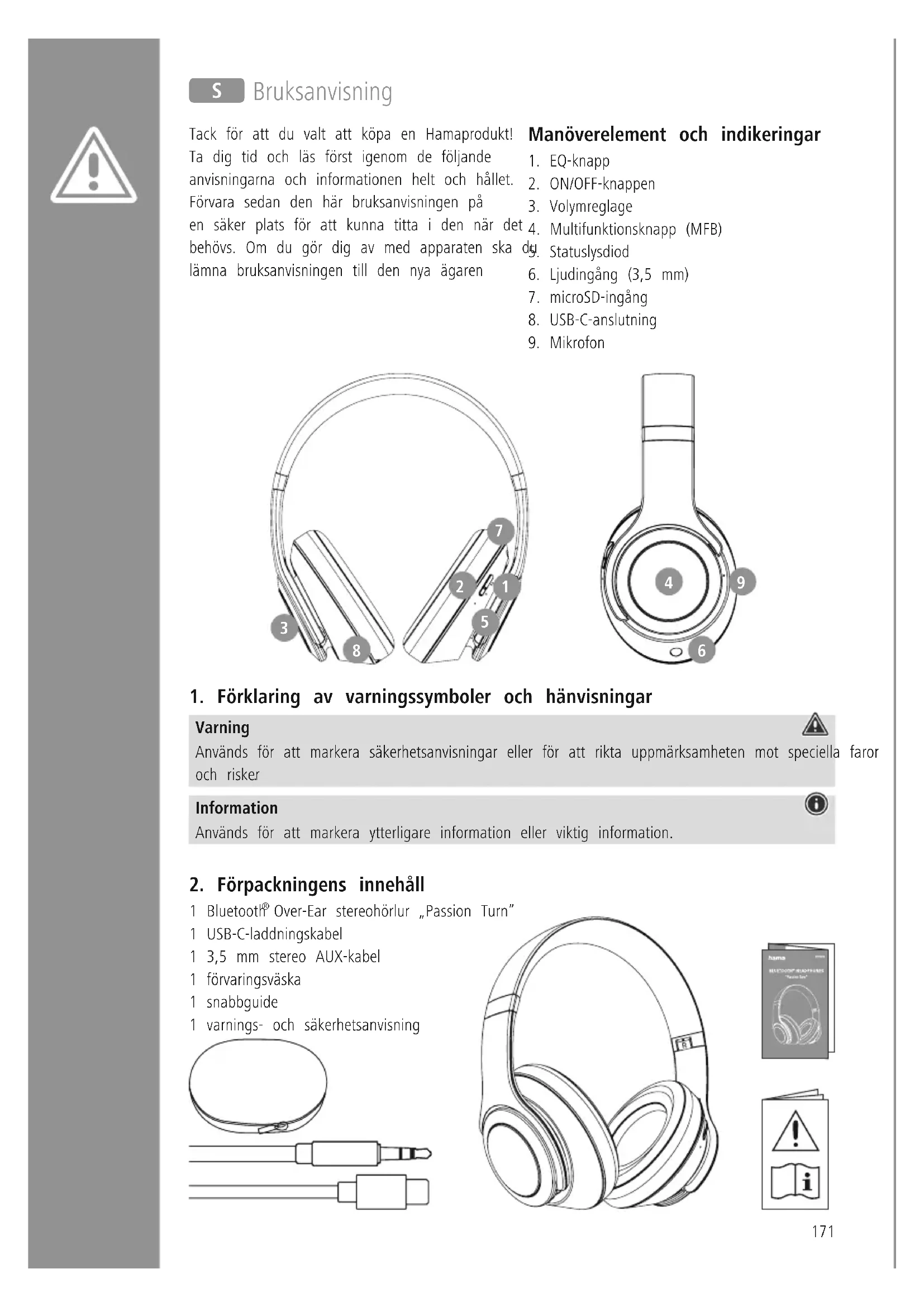 Over-Ear stereohörlur „Passion Turn” 1 USB-C-laddningskabel 1 3,5 mm stereo AUX-kabel 1 förvaringsväska 1 snabbguide 1 varnings- och säkerhetsanvisning