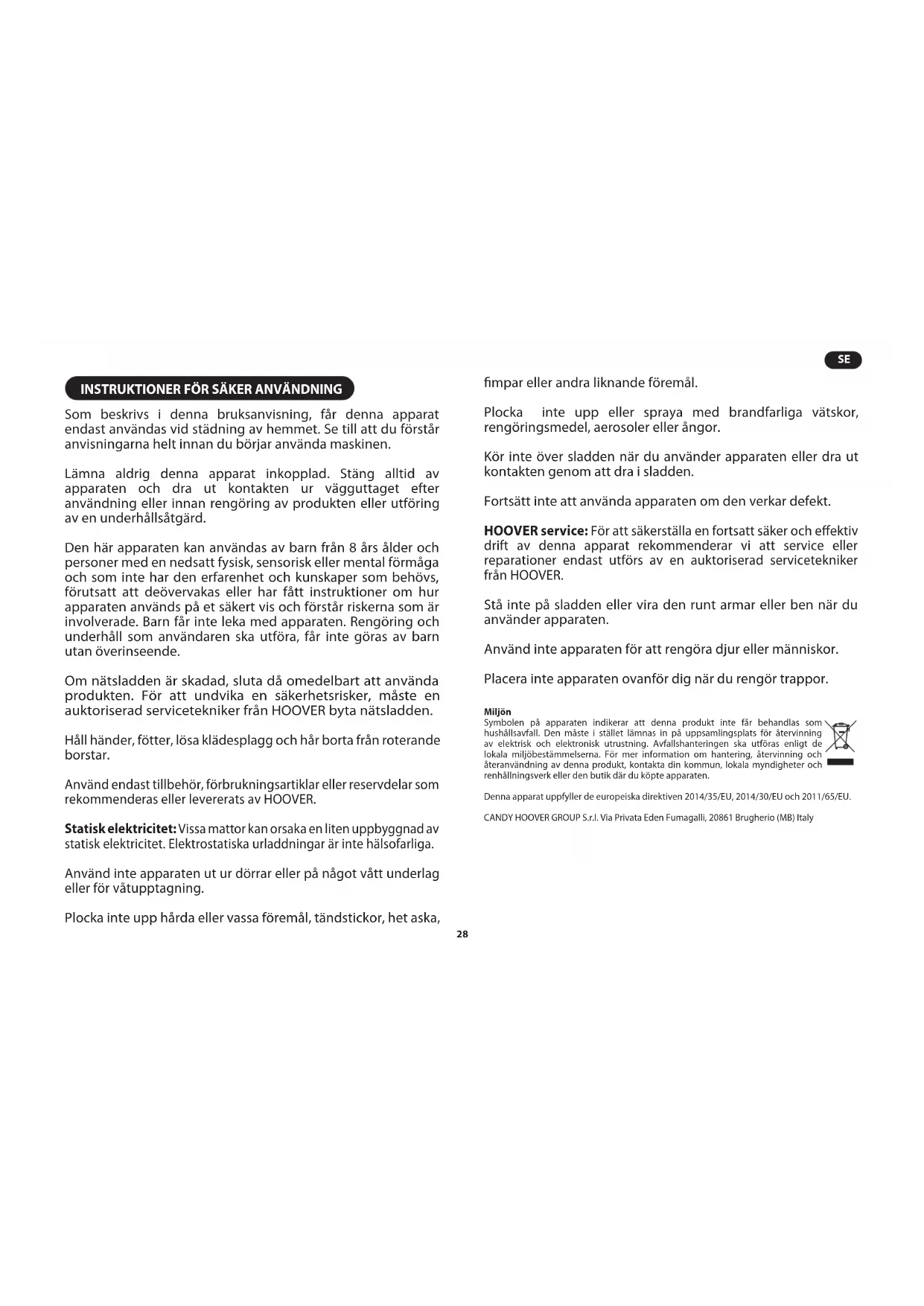INSTRUKTIONER FÖR SÄKER ANVÄNDNING Som beskrivs i denna bruksanvisning, får denna apparat endast användas vid städning av hemmet. Se till att du förstår anvisningarna helt innan du börjar använda maskinen. Lämna aldrig denna apparat inkopplad. Stäng alltid av apparaten och dra ut kontakten ur vägguttaget efter användning eller innan rengöring av produkten eller utföring av en underhållsåtgärd. Den här apparaten kan användas av barn från 8 års ålder och personer med en nedsatt fysisk, sensorisk eller mental förmåga och som inte har den erfarenhet och kunskaper som behövs, förutsatt att deövervakas eller har fått instruktioner om hur apparaten används på et säkert vis och förstår riskerna som är involverade. Barn får inte leka med apparaten. Rengöring och underhåll som användaren ska utföra, får inte göras av barn utan överinseende. Om nätsladden är skadad, sluta då omedelbart att använda produkten. För att undvika en säkerhetsrisker, måste en auktoriserad servicetekniker från HOOVER byta nätsladden. Håll händer, fötter, lösa klädesplagg och hår borta från roterande borstar. Använd endast tillbehör, förbrukningsartiklar eller reservdelar som rekommenderas eller levererats av HOOVER. Statisk elektricitet: Vissa mattor kan orsaka en liten uppbyggnad av statisk elektricitet. Elektrostatiska urladdningar är inte hälsofarliga. Använd inte apparaten ut ur dörrar eller på något vått underlag eller för våtupptagning. Plocka inte upp hårda eller vassa föremål, tändstickor, het aska, mpar eller andra liknande föremål. Plocka inte upp eller spraya med brandfarliga vätskor, rengöringsmedel, aerosoler eller ångor. Kör inte över sladden när du använder apparaten eller dra ut kontakten genom att dra i sladden. Fortsätt inte att använda apparaten om den verkar defekt. HOOVER service: För att säkerställa en fortsatt säker och eektiv drift av denna apparat rekommenderar vi att service eller reparationer endast utförs av en auktoriserad servicetekniker från HOOVER. Stå inte på sladden eller vira den runt armar eller ben när du använder apparaten. Använd inte apparaten för att rengöra djur eller människor. Placera inte apparaten ovanför dig när du rengör trappor. Miljön Symbolen på apparaten indikerar att denna produkt inte får behandlas som hushållsavfall. Den måste i stället lämnas in på uppsamlingsplats för återvinning av elektrisk och elektronisk utrustning. Avfallshanteringen ska utföras enligt de lokala miljöbestämmelserna. För mer information om hantering, återvinning och återanvändning av denna produkt, kontakta din kommun, lokala myndigheter och renhållningsverk eller den butik där du köpte apparaten. Denna apparat uppfyller de europeiska direktiven 2014/35/EU, 2014/30/EU och 2011/65/EU. CANDY HOOVER GROUP S.r.l. Via Privata Eden Fumagalli, 20861 Brugherio (MB) Italy29
