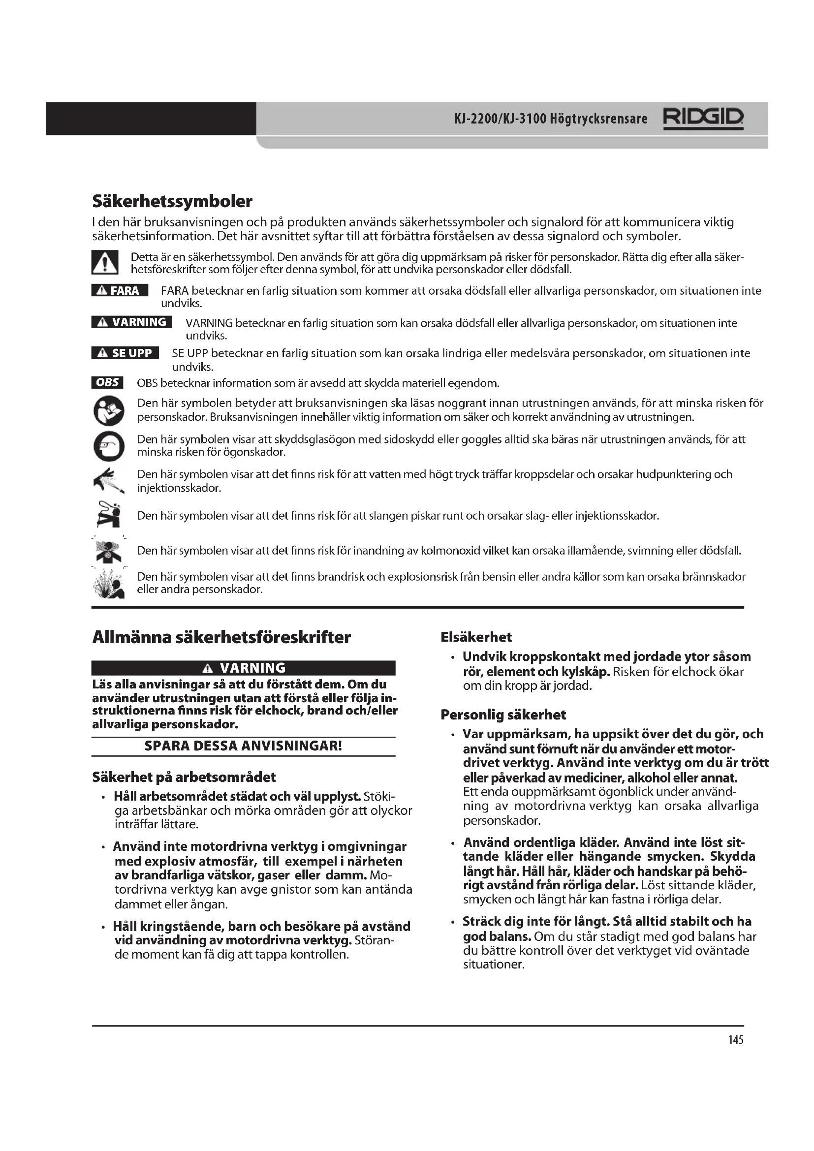 Säkerhetssymboler I den här bruksanvisningen och på produkten används säkerhetssymboler och signalord för att kommunicera viktig säkerhetsinformation. Det här avsnittet syftar till att förbättra förståelsen av dessa signalord och symboler. Detta är en säkerhetssymbol. Den används för att göra dig uppmärksam på risker för personskador. Rätta dig efter alla säker- hetsföreskrifter som följer efter denna symbol, för att undvika personskador eller dödsfall. FARAFARA betecknar en farlig situation som kommer att orsaka dödsfall eller allvarliga personskador, om situationen inte undviks. VARNINGVARNING betecknar en farlig situation som kan orsaka dödsfall eller allvarliga personskador, om situationen inte undviks. SE UPPSE UPP betecknar en farlig situation som kan orsaka lindriga eller medelsvåra personskador, om situationen inte undviks. OBS OBS betecknar information som är avsedd att skydda materiell egendom.Den här symbolen betyder att bruksanvisningen ska läsas noggrant innan utrustningen används, för att minska risken för personskador. Bruksanvisningen innehåller viktig information om säker och korrekt användning av utrustningen. Den här symbolen visar att skyddsglasögon med sidoskydd eller goggles alltid ska bäras när utrustningen används, för att minska risken för ögonskador.Den här symbolen visar att det finns risk för att vatten med högt tryck träffar kroppsdelar och orsakar hudpunktering och injektionsskador.Den här symbolen visar att det finns risk för att slangen piskar runt och orsakar slag- eller injektionsskador. Den här symbolen visar att det finns risk för inandning av kolmonoxid vilket kan orsaka illamående, svimning eller dödsfall. Den här symbolen visar att det finns brandrisk och explosionsrisk från bensin eller andra källor som kan orsaka brännskador eller andra personskador. Allmänna säkerhetsföreskrifter VARNING Läs alla anvisningar så att du förstått dem. Om du använder utrustningen utan att förstå eller följa in-struktionerna finns risk för elchock, brand och/eller allvarliga personskador. SPARA DESSA ANVISNINGAR! Säkerhet på arbetsområdet