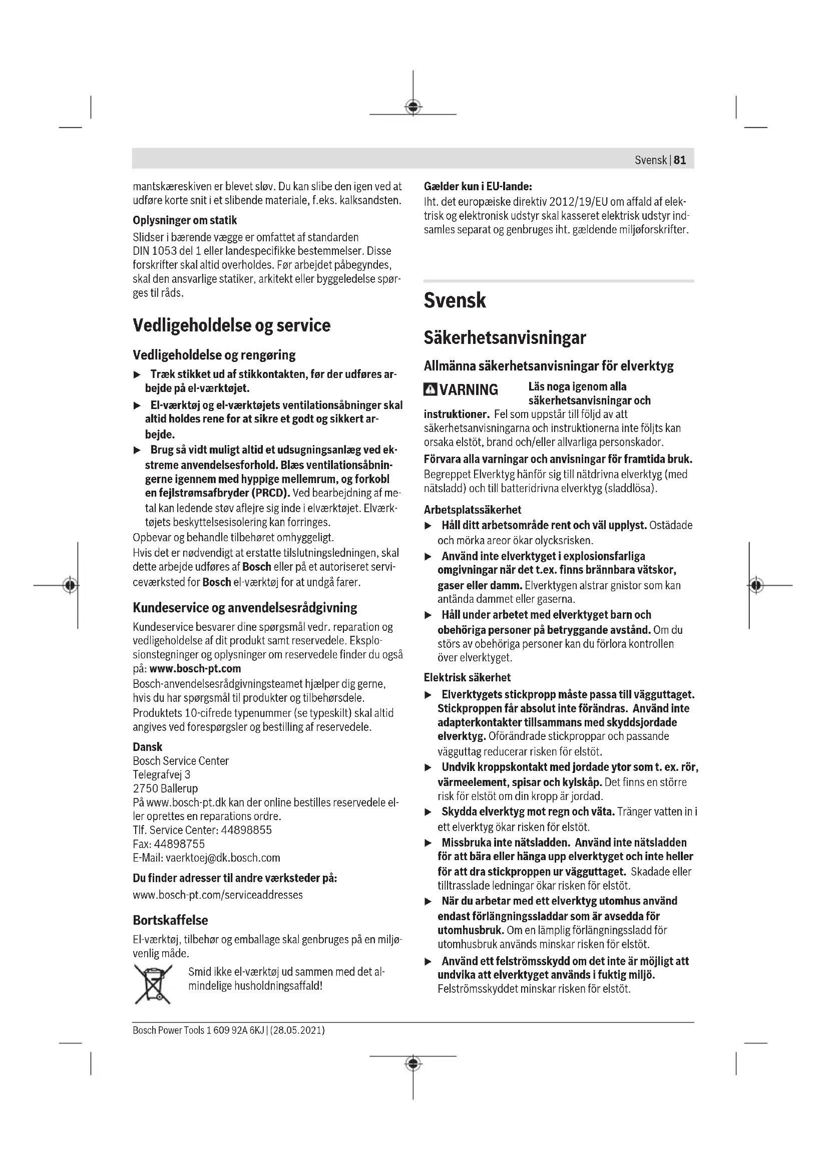De angivne værdier for hastighedstrin er vejledende værdier. u Tilbehørets mærkehastighed skal minimum svare til den maks. hastighed, der er angivet på el-værktøjet. Tilbehør, der anvendes ved en højere hastighed end mær- kehastigheden, kan gå i stykker og slynges af værktøjet. Elektrisk beskyttelse mod genindkobling Den elektriske beskyttelse mod genindkobling forhindrer en ukontrolleret start af el-værktøjet efter afbrydelse af strøm- tilførslen. For genindkobling skal du sætte tænd/sluk-kontakten (2) i frakoblet position og tænde el-værktøjet igen. Arbejdsvejledning u Træk stikket ud af stikkontakten, før der udføres ar- bejde på el‑værktøjet. u Forsigtig ved slidsning i bærende vægge, se afsnittet "Oplysninger om statik". u Fastspænd emnet, hvis det ikke ligger sikkert på grund af sin egenvægt. u Belast ikke el-værktøjet så meget, at det kommer til stilstand. u Lad el-værktøjet køre i tomgang i et par minutter efter stærk belastning, så indsatsværktøjet kan afkøle. u El-værktøjet må ikke benyttes med en skærestander. u Rør ikke ved slibe- og skæreskiverne, før de er kølet af. Skiverne bliver meget varmt under arbejdet. Skrubslibning u Anvend aldrig skæreskiver til skrubslibning. Med en hældningsvinkel på 30° til 40° opnår du det bedste arbejdsresultat ved skrubslibning. Bevæg el-værktøjet frem og tilbage med et moderat tryk. Derved undgår du, at emnet bliver for varmt, at det misfarves, eller at der opstår riller. Lamelslibeskive Med lamelslibeskiven (tilbehør) kan du også bearbejde hvæl- vede overflader og profiler. Lamelslibeskiver har en væsent- ligt længere levetid, lavere støjniveau og lavere slibetempe- raturer end normale slibeskiver. Skæring af metal u Brug altid en beskyttelseskappe til skæring ved gen- nemskæring med bundne slibemidler (8). Ved skæring skal der arbejdes med en jævn fremføring, som er afstemt efter materialet, der bearbejdes. Skæreskiven må ikke påføres tryk, komme i spænd eller udsættes for sving- ninger. Udløbende skæreskiver må ikke bremses ved at trykke på si- den. El-værktøjet skal altid føres i modløb. Ellers er der risiko for, at det ukontrolleret trykkes ud af snittet. Ved skæring af profiler og fir- kantrør er det bedst at star- te ved det mindste tvær- snit. Skæring af sten u Sørg for tilstrækkelig støvopsugning, når der skæres i sten. u Brug beskyttelsesmaske. u El-værktøjet må kun anvendes til tørskæring/tørslib- ning. Brug så vidt muligt en diamantskæreskive til overskæring af sten. Ved anvendelse af udsugningsskærmen til skæring med fø- ringsslæde (22) skal støvsugeren være godkendt til udsug- ning af stenstøv. Bosch tilbyder egnede støvsugere. Start el-værktøjet, og sæt det på emnet med den for- reste del af føringsslæden. Skub el-værktøjet med et moderat tryk, tilpasset til materialet der skal bear- bejdes. Ved skæring af særligt hår- de materialer, f.eks. beton med højt kiselindhold, kan diamantskæreskiven blive overophedet og derved tage skade. En krans af gnister, der følger den omløbende dia- mantskæreskive, er et tydeligt tegn på dette. I så fald skal du afbryde skærearbejdet og lade diamantskæ- reskiven køre kort tid i tomgang ved det højeste omdrej- ningstal for at afkøle den. Hvis arbejdet skrider mærkbart langsommere frem, og der dannes en lysende krans af gnister, er det tegn på, at dia- 1 609 92A 6KJ | (28.05.2021) Bosch Power ToolsSvensk | 81 mantskæreskiven er blevet sløv. Du kan slibe den igen ved at udføre korte snit i et slibende materiale, f.eks. kalksandsten. Oplysninger om statik Slidser i bærende vægge er omfattet af standarden DIN1053 del 1 eller landespecifikke bestemmelser. Disse forskrifter skal altid overholdes. Før arbejdet påbegyndes, skal den ansvarlige statiker, arkitekt eller byggeledelse spør- ges til råds. Vedligeholdelse og service Vedligeholdelse og rengøring u Træk stikket ud af stikkontakten, før der udføres ar- bejde på el‑værktøjet. u El‑værktøj og el‑værktøjets ventilationsåbninger skal altid holdes rene for at sikre et godt og sikkert ar- bejde. u Brug så vidt muligt altid et udsugningsanlæg ved ek- streme anvendelsesforhold. Blæs ventilationsåbnin- gerne igennem med hyppige mellemrum, og forkobl en fejlstrømsafbryder (PRCD). Ved bearbejdning af me- tal kan ledende støv aflejre sig inde i elværktøjet. Elværk- tøjets beskyttelsesisolering kan forringes. Opbevar og behandle tilbehøret omhyggeligt. Hvis det er nødvendigt at erstatte tilslutningsledningen, skal dette arbejde udføres af Bosch eller på et autoriseret servi- ceværksted for Bosch el‑værktøj for at undgå farer. Kundeservice og anvendelsesrådgivning Kundeservice besvarer dine spørgsmål vedr. reparation og vedligeholdelse af dit produkt samt reservedele. Eksplo- sionstegninger og oplysninger om reservedele finder du også på: www.bosch-pt.com Bosch-anvendelsesrådgivningsteamet hjælper dig gerne, hvis du har spørgsmål til produkter og tilbehørsdele. Produktets 10‑cifrede typenummer (se typeskilt) skal altid angives ved forespørgsler og bestilling af reservedele. Dansk Bosch Service Center Telegrafvej 3 2750 Ballerup På www.bosch-pt.dk kan der online bestilles reservedele el- ler oprettes en reparations ordre. Tlf. Service Center: 44898855 Fax: 44898755 E-Mail: vaerktoej@dk.bosch.com Du finder adresser til andre værksteder på: www.bosch-pt.com/serviceaddresses Bortskaffelse El‑værktøj, tilbehør og emballage skal genbruges på en miljø- venlig måde. Smid ikke el-værktøj ud sammen med det al- mindelige husholdningsaffald! Gælder kun i EU‑lande: Iht. det europæiske direktiv 2012/19/EU om affald af elek- trisk og elektronisk udstyr skal kasseret elektrisk udstyr ind- samles separat og genbruges iht. gældende miljøforskrifter. Svensk Säkerhetsanvisningar Allmänna säkerhetsanvisningar för elverktyg VARNING Läs noga igenom alla säkerhe