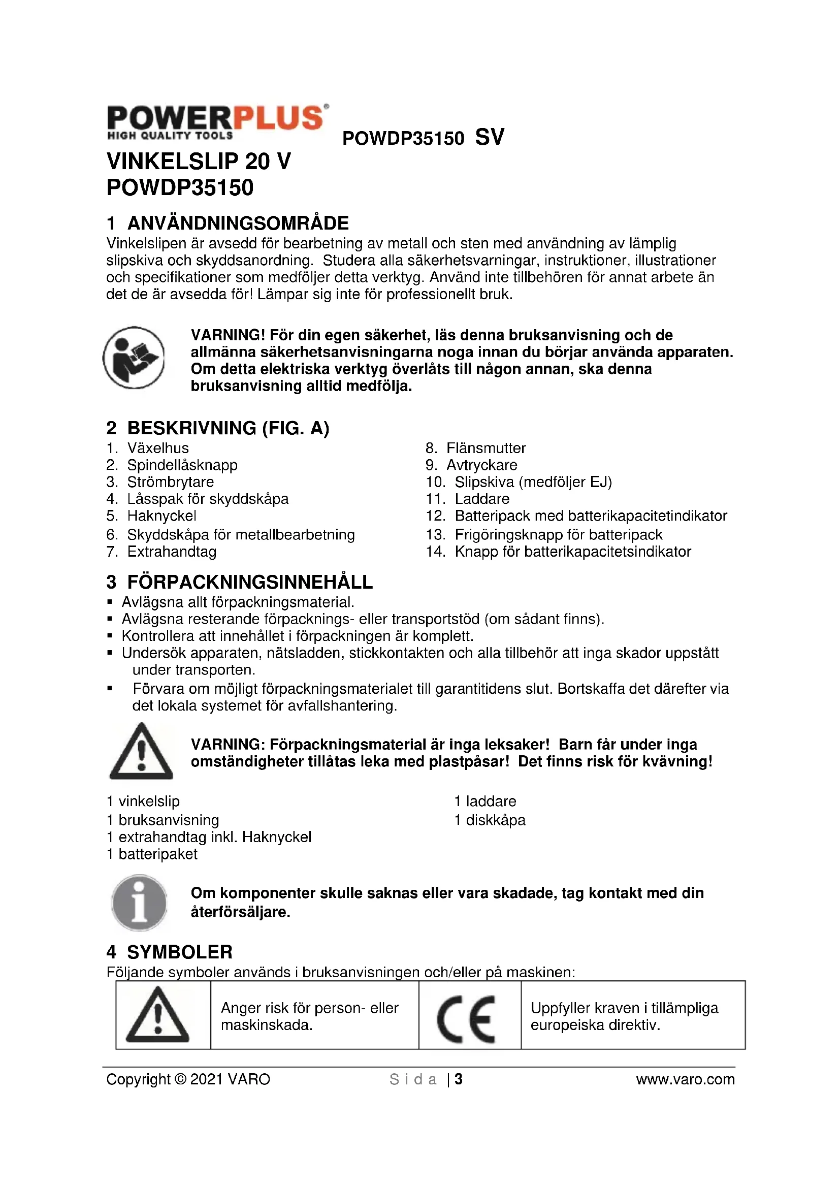 - Se till att eventuella gnistor inte medför fara för kringstående eller kan komma i kontakt med lättantändliga ämnen.POWDP35150 SV Copyright © 2021 VARO S i d a | 7 www.varo.com