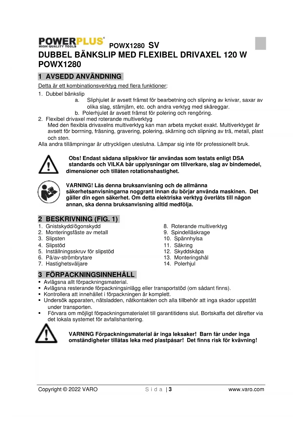 - Sträck dig inte för långt. Stå alltid säkert och med god balans i alla situationer. Detta medger bättre kontroll av det elektriska verktyget i oförutsedda situationer.POWX1280 SV Copyright © 2022 VARO S i d a | 6 www.varo.com