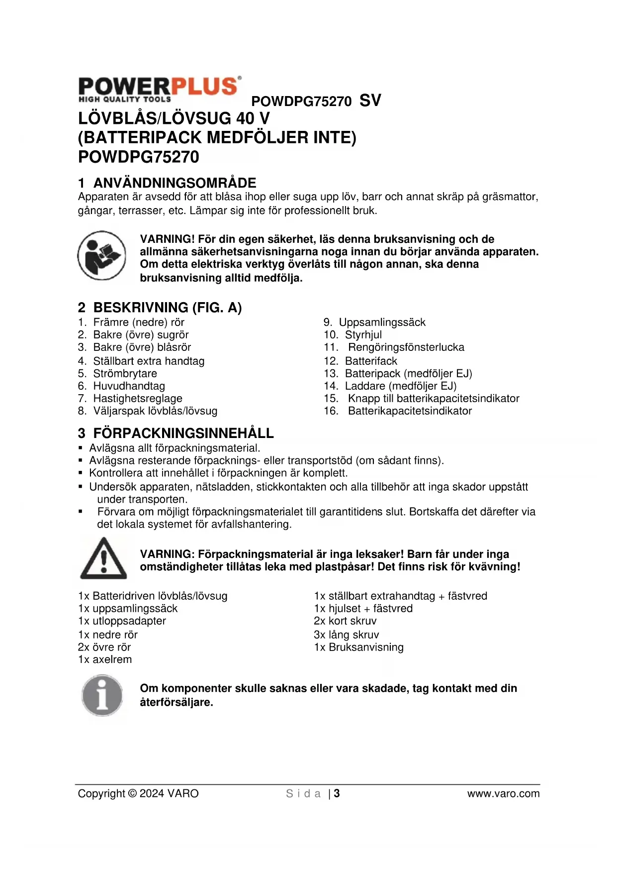När utrustningen efter långvarigt bruk tjänat ut och behöver ersättas, får den inte slängas med hushållssoporna, utan ska deponeras på ett miljömässigt säkert sätt. Avfall härrörande från elektrisk utrustning får inte slängas med hushållssoporna. Lämna elektrisk och elektronisk utrustning på avsedda uppsamlingsplatser för återvinning. Kontakta lokala myndigheter eller din lokala återförsäljare för information om hur förbrukade produkter ska returneras.POWDPG75270 SV Copyright © 2024 VARO S i d a | 14 www.varo.com
