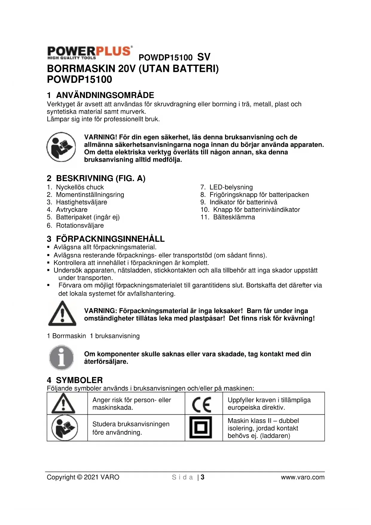 - När du kasserar batterier, följ instruktionerna i avsnittet "Miljöhänsyn".POWDP15100 SV Copyright © 2021 VARO S i d a | 7 www.varo.com