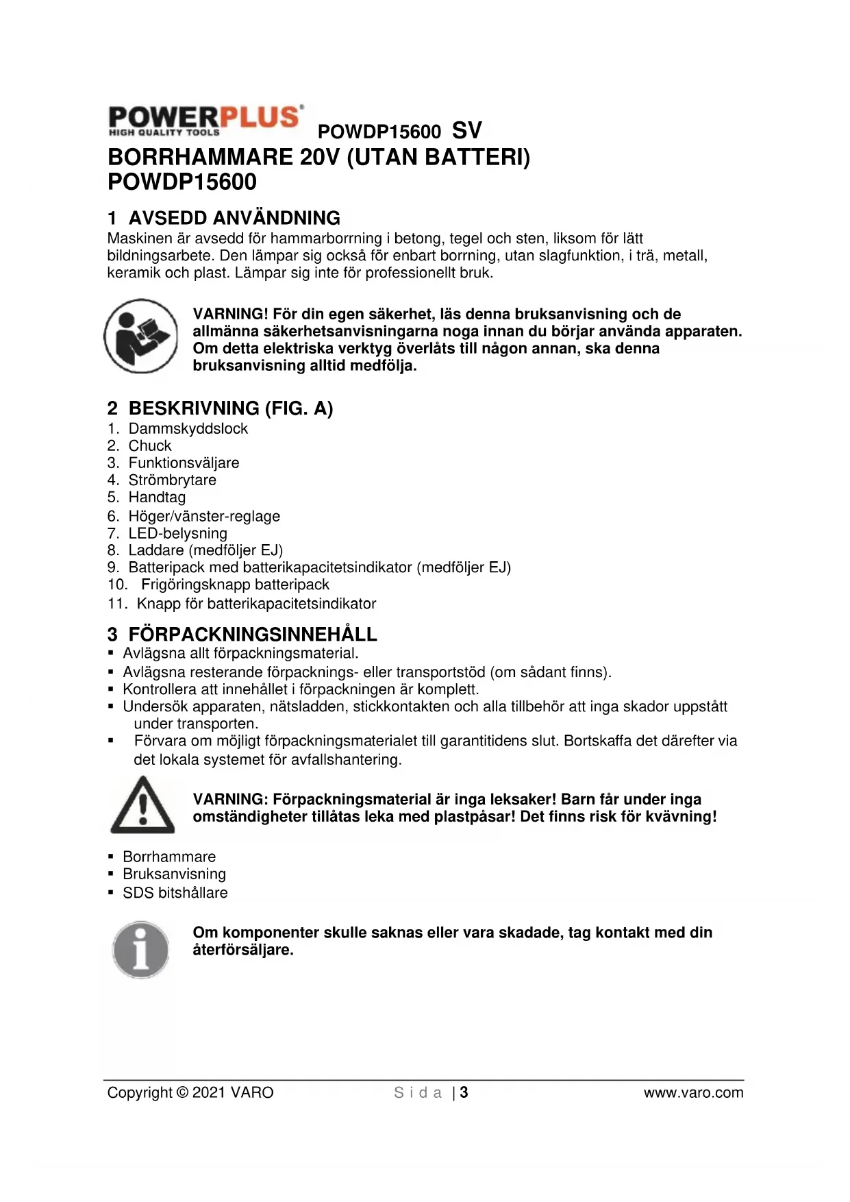- Låt endast kvalificerat fackfolk reparera verktyget med användande av originalreservdelar. Detta för att garantera att verktygets säkerhetsstandards vidmakthålls.POWDP15600 SV Copyright © 2021 VARO S i d a | 6 www.varo.com