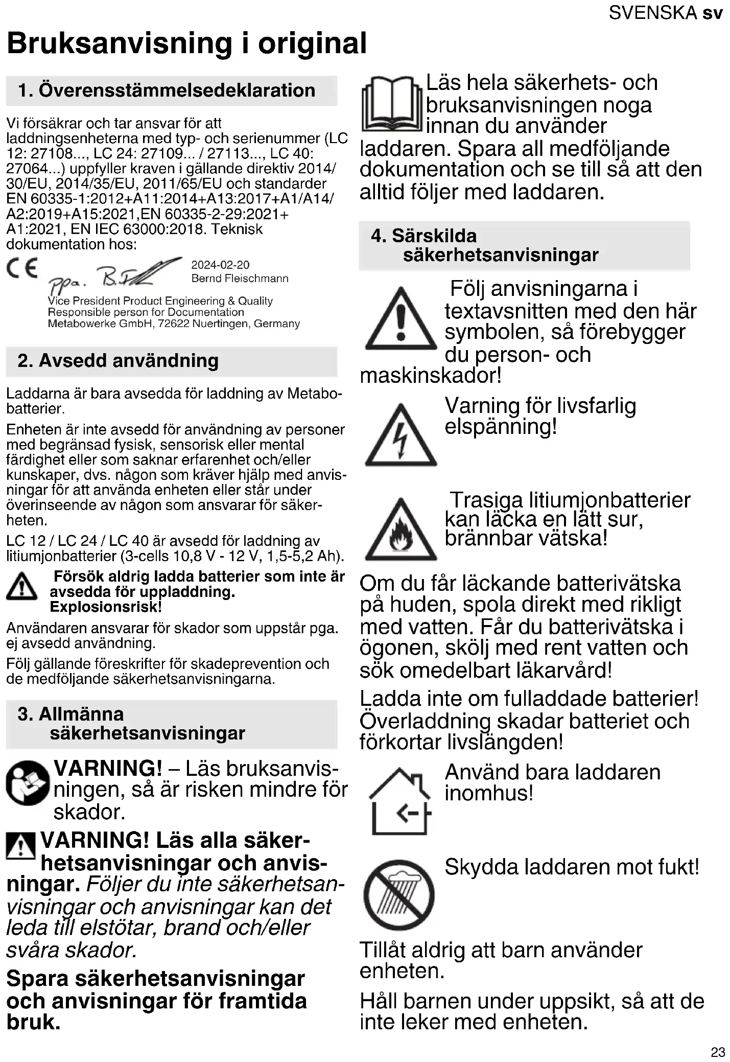 Bruksanvisning i original Vi försäkrar och tar ansvar för att laddningsenheterna med typ- och serienummer (LC 12: 27108..., LC 24: 27109... / 27113..., LC 40: 27064...) uppfyller kraven i gällande direktiv 2014/ 30/EU, 2014/35/EU, 2011/65/EU och standarder EN 60335-1:2012+A11:2014+A13:2017+A1/A14/ A2:2019+A15:2021,EN 60335-2-29:2021+ A1:2021, EN IEC 63000:2018. Teknisk dokumentation hos: Laddarna är bara avsedda för laddning av Metabo- batterier. Enheten är inte avsedd för användning av personer med begränsad fysisk, sensorisk eller mental färdighet eller som saknar erfarenhet och/eller kunskaper, dvs. någon som kräver hjälp med anvis- ningar för att använda enheten eller står under överinseende av någon som ansvarar för säker- heten. LC 12 / LC 24 / LC 40 är avsedd för laddning av litiumjonbatterier (3-cells 10,8 V - 12 V, 1,5-5,2 Ah). Försök aldrig ladda batterier som inte är avsedda för uppladdning. Explosionsrisk! Användaren ansvarar för skador som uppstår pga. ej avsedd användning. Följ gällande föreskrifter för skadeprevention och de medföljande säkerhetsanvisningarna. VARNING! – Läs bruksanvis- ningen, så är risken mindre för skador. VARNING! Läs alla säker- hetsanvisningar och anvis- ningar. Följer du inte säkerhetsan- visningar och anvisningar kan det leda till elstötar, brand och/eller svåra skador. Spara säkerhetsanvisningar och anvisningar för framtida bruk. Läs hela säkerhets- och bruksanvisningen noga innan du använder laddaren. Spara all medföljande dokumentation och se till så att den alltid följer med laddaren. Följ anvisningarna i textavsnitten med den här symbolen, så förebygger du person- och maskinskador! Varning för livsfarlig elspänning! Trasiga litiumjonbatterier kan läcka en lätt sur, brännbar vätska! Om du får läckande batterivätska på huden, spola direkt med rikligt med vatten. Får du batterivätska i ögonen, skölj med rent vatten och sök omedelbart läkarvård! Ladda inte om fulladdade batterier! Överladdning skadar batteriet och förkortar livslängden! Använd bara laddaren inomhus! Skydda laddaren mot fukt! Tillåt aldrig att barn använder enheten. Håll barnen under uppsikt, så att de inte leker med enheten.