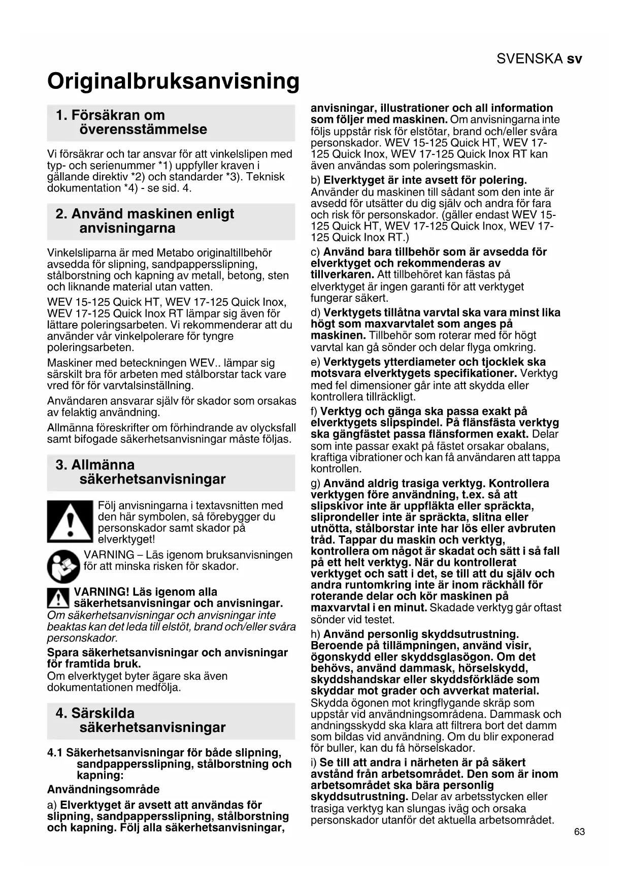 b) Elverktyget ar inte avsett for polering. Anvanderu maskinen till sadtant som den inte ar avseddd for utsatter du dig sjalv och andra for fara och risk for personskador.(galler endast WEV 15- 125 Quick HT, WEV 17-125 Quick Inox, WEV 17- 125 Quick Inox RT.)
