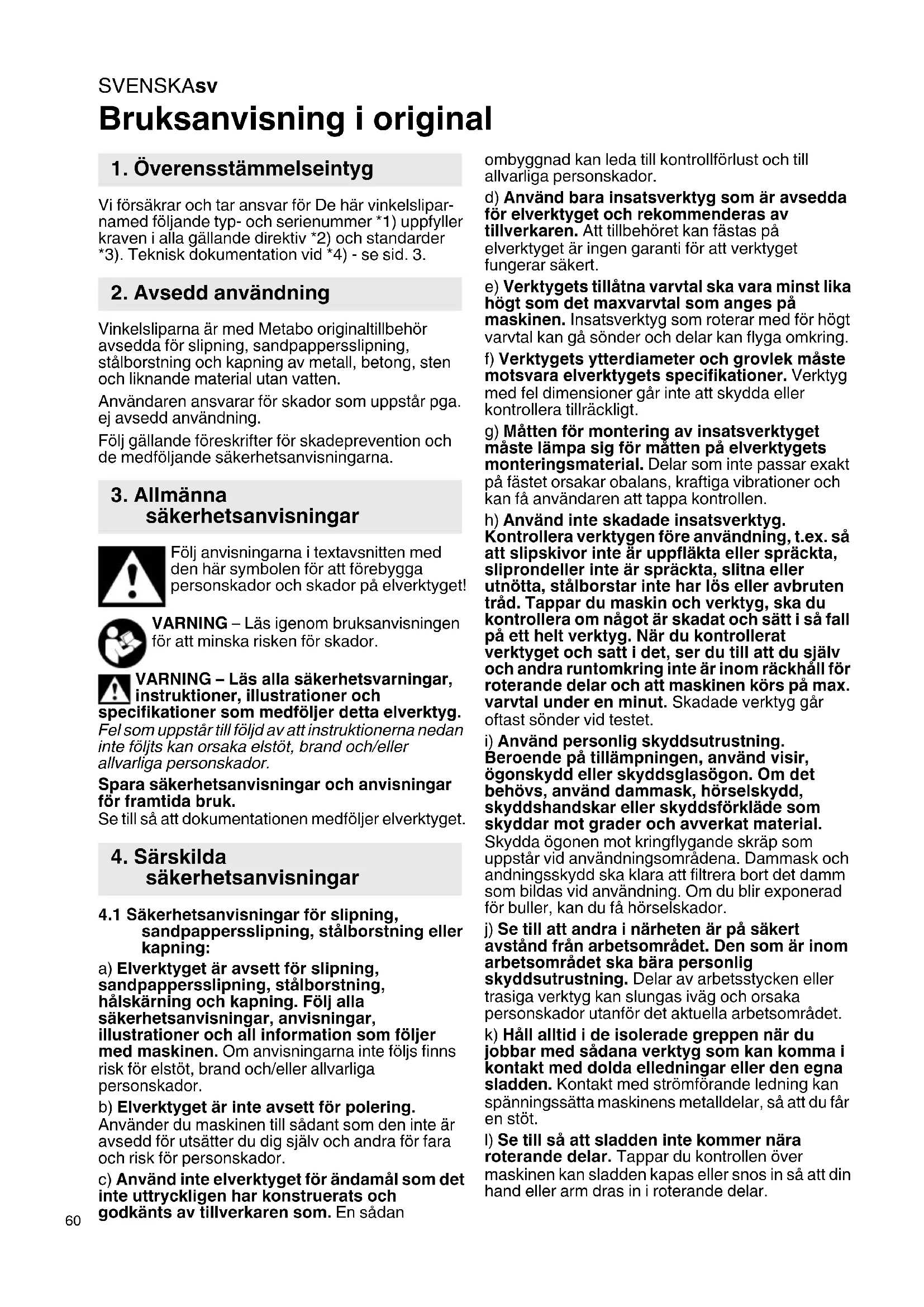 Bruksanvisning i original Vi försäkrar och tar ansvar för De här vinkelslipar- named följande typ- och serienummer *1) uppfyller kraven i alla gällande direktiv *2) och standarder *3). Teknisk dokumentation vid *4) - se sid. 3. Vinkelsliparna är med Metabo originaltillbehör avsedda för slipning, sandpappersslipning, stålborstning och kapning av metall, betong, sten och liknande material utan vatten. Användaren ansvarar för skador som uppstår pga. ej avsedd användning. Följ gällande föreskrifter för skadeprevention och de medföljande säkerhetsanvisningarna. Följ anvisningarna i textavsnitten med den här symbolen för att förebygga personskador och skador på elverktyget! VARNING – Läs igenom bruksanvisningen för att minska risken för skador. VARNING – Läs alla säkerhetsvarningar, instruktioner, illustrationer och specifikationer som medföljer detta elverktyg. Fel som uppstår till följd av att instruktionerna nedan inte följts kan orsaka elstöt, brand och/eller allvarliga personskador. Spara säkerhetsanvisningar och anvisningar för framtida bruk. Se till så att dokumentationen medföljer elverktyget.