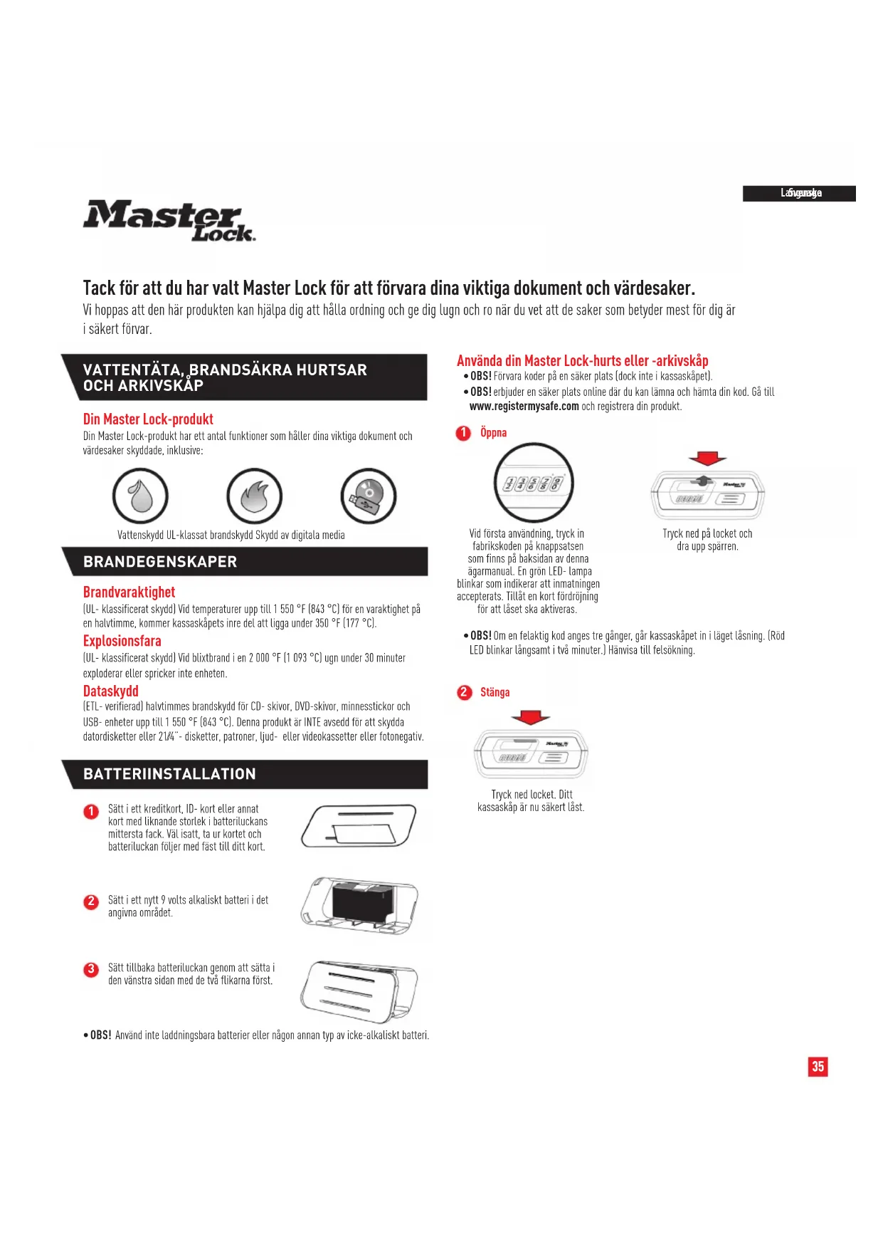 Tack for att du har valt Master Lock for att forvara dina viktiga Dokument och vardesaker.