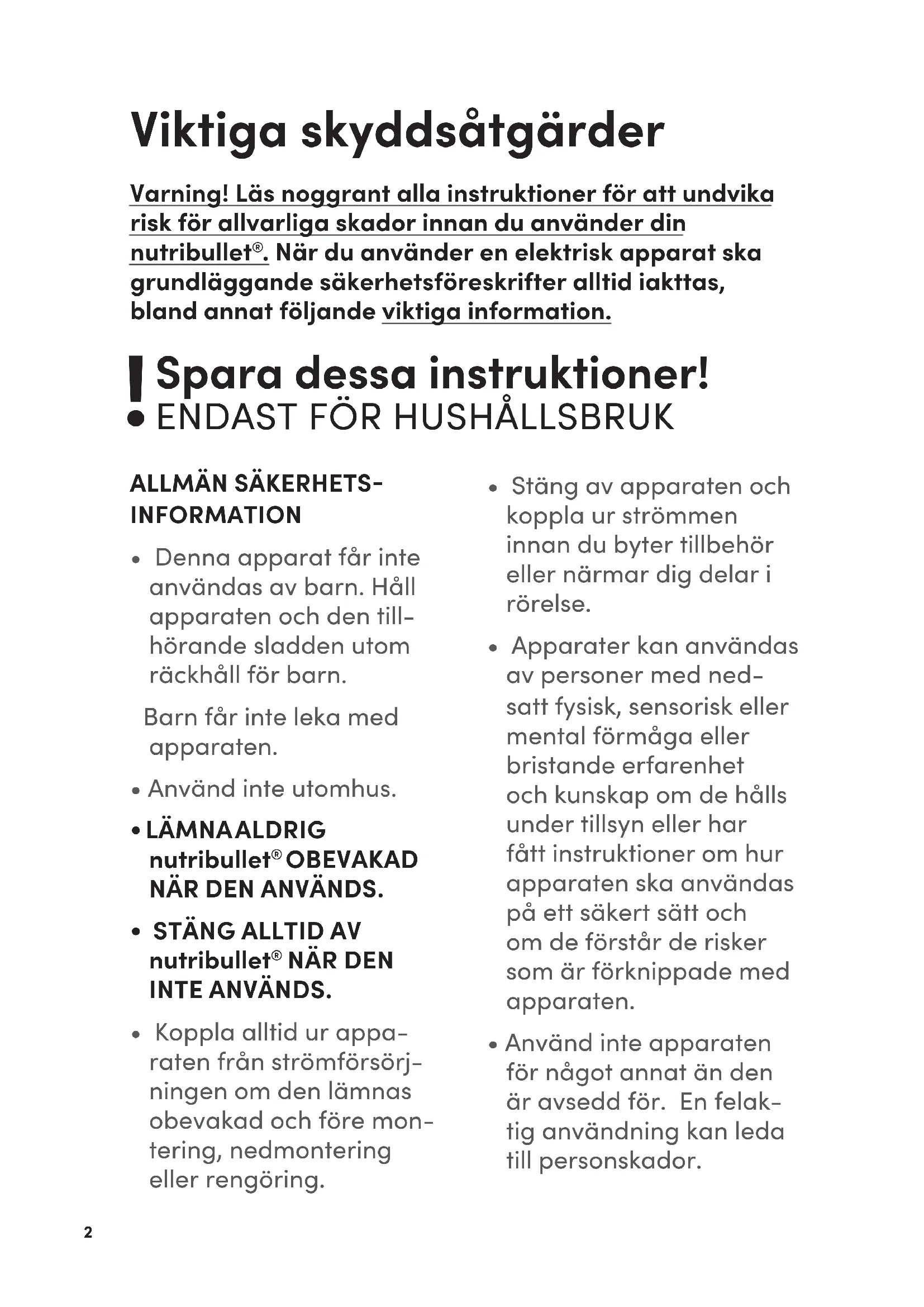 - Koppla alltid ur appa- raten från strömförsörj- ningen om den lämnas obevakad och före mon- tering, nedmontering eller rengöring. Viktiga skyddsåtgärder Varning! Läs noggrant alla instruktioner för att undvika risk för allvarliga skador innan du använder din nutribullet