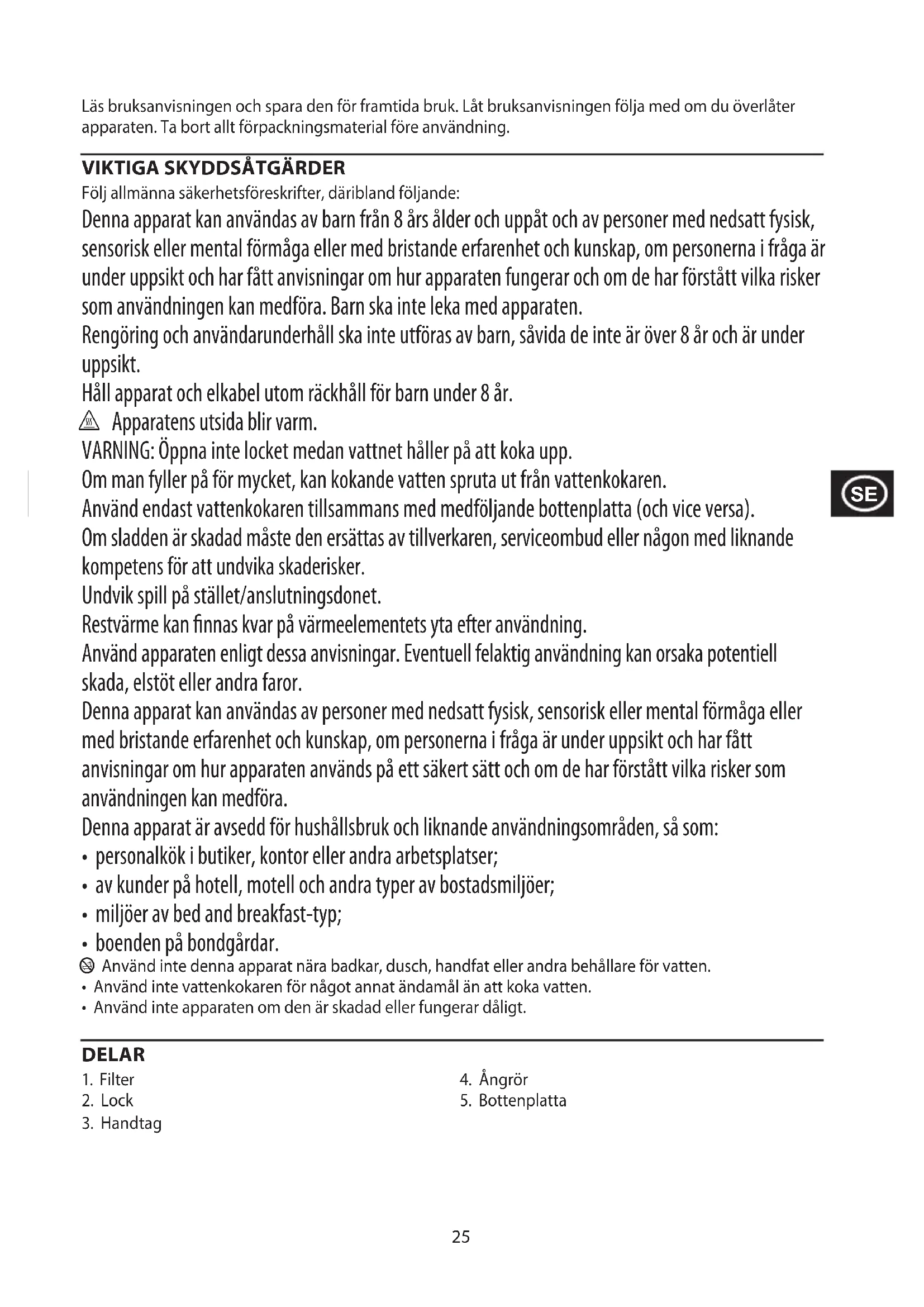 Följ allmänna säkerhetsföreskrifter, däribland följande: Denna apparat kan användas av barn från 8 års ålder och uppåt och av personer med nedsatt fysisk, sensorisk eller mental förmåga eller med bristande erfarenhet och kunskap, om personerna i fråga är under uppsikt och har fått anvisningar om hur apparaten fungerar och om de har förstått vilka risker som användningen kan medföra. Barn ska inte leka med apparaten. Rengöring och användarunderhåll ska inte utföras av barn, såvida de inte är över 8 år och är under uppsikt. Håll apparat och elkabel utom räckhåll för barn under 8 år. h Apparatens utsida blir varm. VARNING: Öppna inte locket medan vattnet håller på att koka upp. Om man fyller på för mycket, kan kokande vatten spruta ut från vattenkokaren. Använd endast vattenkokaren tillsammans med medföljande bottenplatta (och vice versa). Om sladden är skadad måste den ersättas av tillverkaren, serviceombud eller någon med liknande kompetens för att undvika skaderisker. Undvik spill på stället/anslutningsdonet. Restvärme kan nnas kvar på värmeelementets yta efter användning. Använd apparaten enligt dessa anvisningar. Eventuell felaktig användning kan orsaka potentiell skada, elstöt eller andra faror. Denna apparat kan användas av personer med nedsatt fysisk, sensorisk eller mental förmåga eller med bristande erfarenhet och kunskap, om personerna i fråga är under uppsikt och har fått anvisningar om hur apparaten används på ett säkert sätt och om de har förstått vilka risker som användningen kan medföra. Denna apparat är avsedd för hushållsbruk och liknande användningsområden, så som: