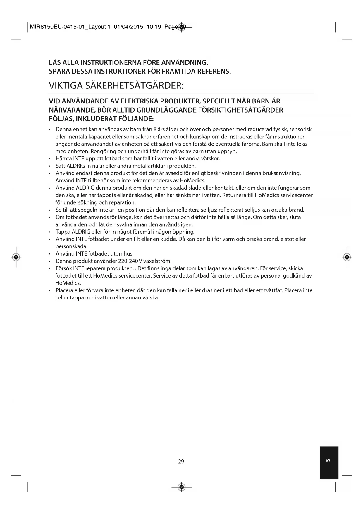 - Försök INTE reparera produkten. . Det finns inga delar som kan lagas av användaren. För service, skicka fotbadet till ett HoMedics servicecenter. Service av detta fotbad får enbart utföras av personal godkänd av HoMedics.
