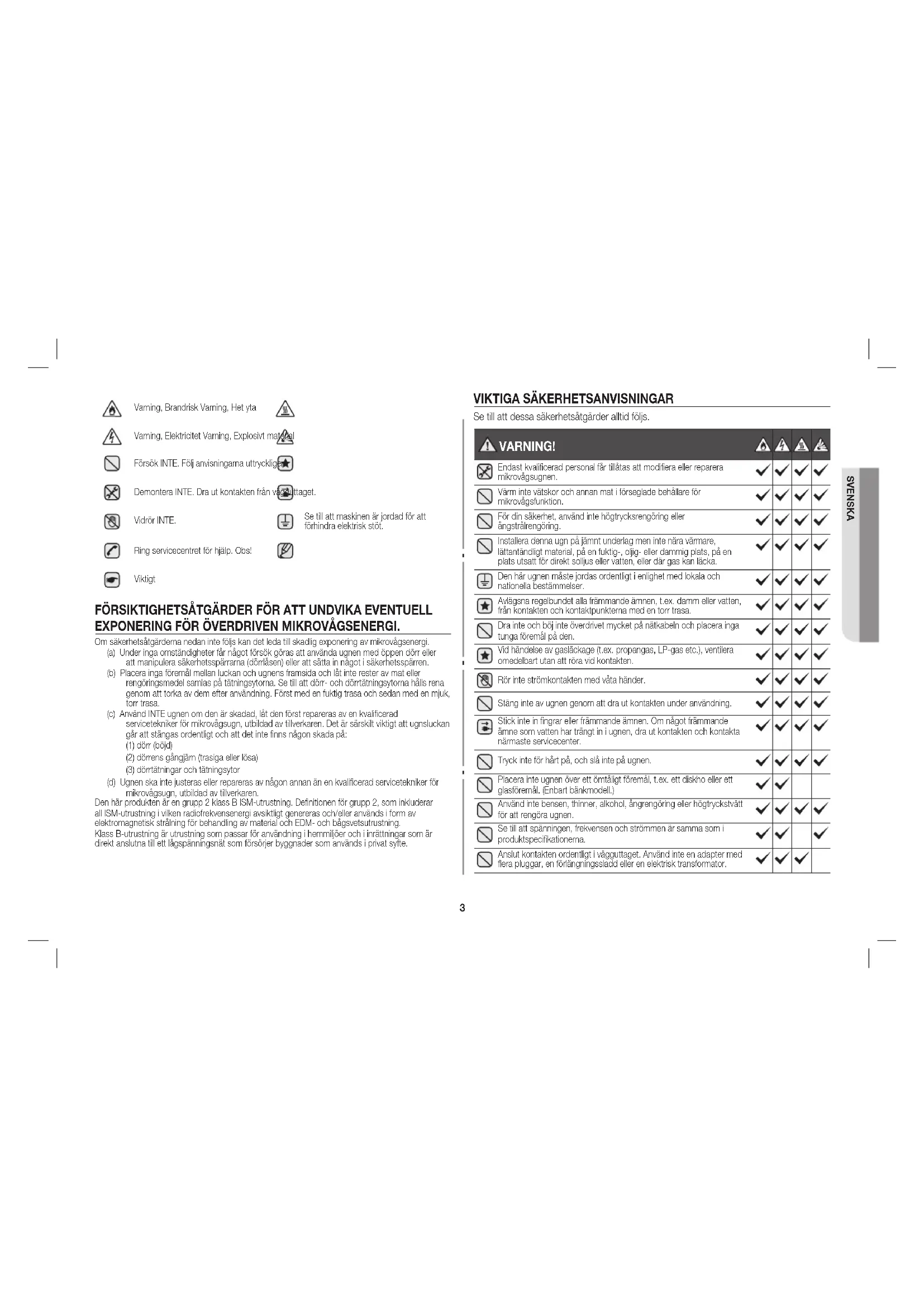 - Om ugnen inte hålls ren kan det leda till att ytan försämras vilket kan påverka apparaten negativt samt eventuellt leda till risker. TECKENFÖRKLARING FÖR SYMBOLER OCH IKONER VARNING! Faror eller osäker användning som kan leda till allvarlig personskada eller död. VAR FÖRSIKTIG! Faror eller osäker användning som kan leda till mindre personskada eller fastighetsskada. Använd detta instruktionshäfte ....................................................................................................... 2 Viktig säkerhetsinformation ........................................................................................................... 2 Teckenförklaring för symboler och ikoner ....................................................................................... 2 Försiktighetsåtgärder för att undvika eventuell exponering för överdriven mikrovågsenergi. ........................................................................................................................... 3 Viktiga säkerhetsanvisningar .......................................................................................................... 3 Korrekt avfallshantering av produkten (elektriska och elektroniska produkter) ................................. 5 Installations- och ledningsinstruktioner ........................................................................................... 6 Lampa (ljuskälla) ............................................................................................................................ 6 Ugn ............................................................................................................................................... 6 Manöverpanel ................................................................................................................................ 7 Display .......................................................................................................................................... 7 Ställa in tiden ................................................................................................................................. 7 Matlagningsinstruktioner ................................................................................................................ 8 Tillagning/Uppvärmning ................................................................................................................. 8 Effektnivåer och tidsvariationer ....................................................................................................... 9 Stoppa tillagningen ........................................................................................................................ 10 Upprepa samma sak ..................................................................................................................... 10 Att använda knappen +20sek ........................................................................................................ 10 Använda funktionen snabbupptining .............................................................................................. 11 Minnesknappsprogrammering ....................................................................................................... 11 Hur man hanterar minnesuppvärmning .......................................................................................... 13 Hur man använder dubbla kvantitetsknappen ................................................................................ 13 Dubbel kvantitetsknapp-programmering ........................................................................................ 14 Kontrollera pipsignalen................................................................................................................... 14 Programmering av luftfilterrengöringstid ......................................................................................... 15 Felkoder ........................................................................................................................................ 15 Dolda knappar ............................................................................................................................... 16 Skötsel av din mikrovågsugn ......................................................................................................... 16 Rengöring av takhöljet ................................................................................................................... 17 Rengöra luftfiltret ........................................................................................................................... 17 Installationsanvisningar för stapling ................................................................................................ 17 Guide över matlagningskärl............................................................................................................ 18 Rengöra din mikrovågsugn ............................................................................................................ 22 Förvaring och reparation av din mikrovågsugn ............................................................................... 22 Tekniska specifikationer ................................................................................................................. 233 SVENSKA Varning, Brandrisk Varning, Het yta Varning, Elektricitet Varning, Explosivt material Försök INTE. Följ anvisningarna uttryckligen. Demontera INTE. Dra ut kontakten från vägguttaget. Vidrör INTE. Se till att maskinen är jordad för att förhindra elektrisk stöt. Ring servicecentret för hjälp. Obs! Viktigt FÖRSIKTIGHETSÅTGÄRDER FÖR ATT UNDVIKA EVENTUELL EXPONERING FÖR ÖVERDRIVEN MIKROVÅGSENERGI. Om säkerhetsåtgärderna nedan inte följs kan det leda till skadlig exponering av mikrovågsenergi. (a) Under inga omständigheter får något försök göras att använda ugnen med öppen dörr eller att manipulera säkerhetsspärrarna (dörrlå