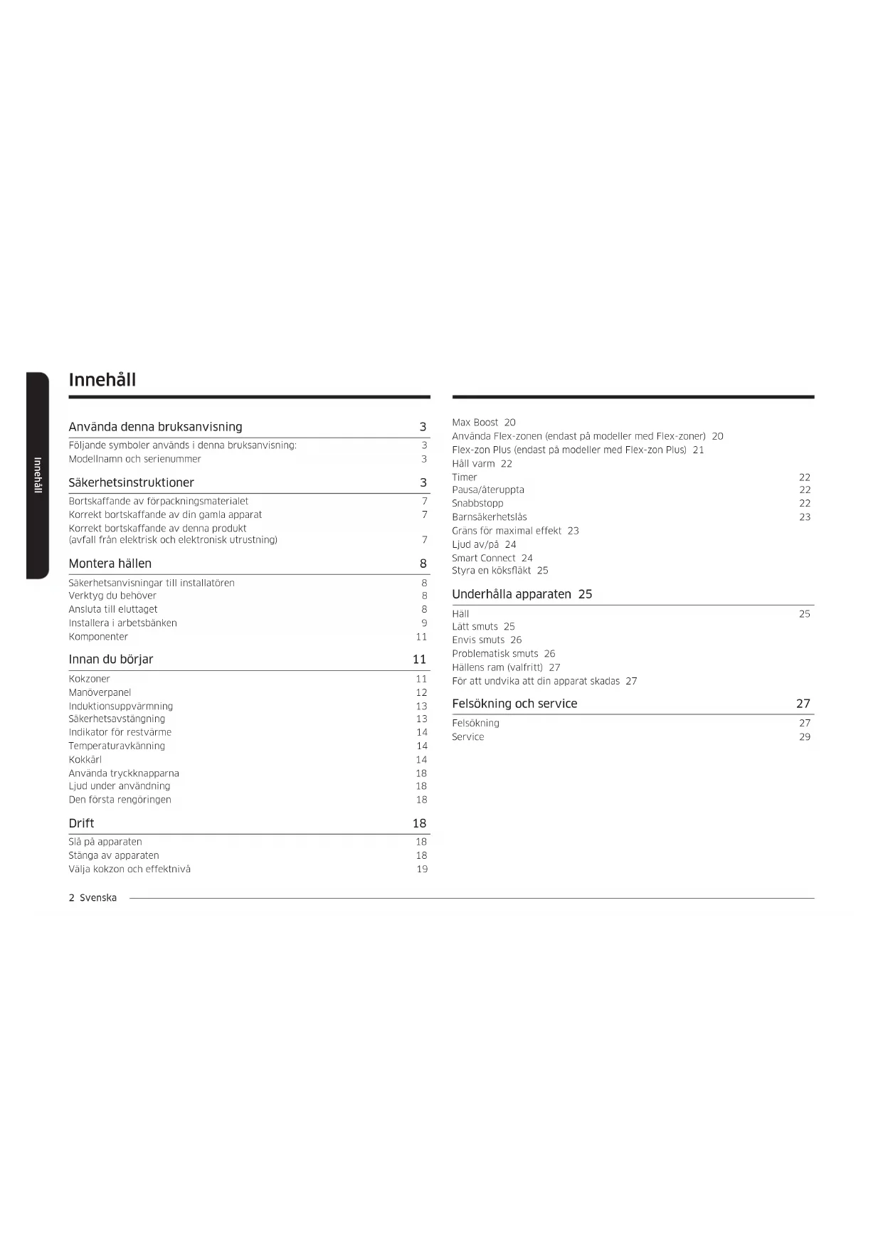 - (opłata według taryfy operatora) http://www.samsung.com/pl/ support/ ROMANIA 0800872678 - Apel gratuit *8000 - Apel tarifat în reţea Program Call Center Luni - Vineri: 9 AM - 6 PM www.samsung.com/ro/support SERBIA 011 321 6899 www.samsung.com/rs/support SLOVAKIA 0800 - SAMSUNG (0800-726 786) www.samsung.com/sk/support LITHUANIA 8-800-77777 www.samsung.com/lt/support LATVIA 8000-7267 www.samsung.com/lv/support ESTONIA 800-7267 www.samsung.com/ee/support SLOVENIA 080 697 267 (brezplačna številka) www.samsung.com/si/support KOSOVO 038 40 30 90 www.samsung.com/support SPØRGSMÅL ELLER KOMMENTARER?Induktionshä ll Bruksanvisning2 Svenska Innehåll Innehåll Max Boost 20 Använda Flex-zonen (endast på modeller med Flex-zoner) 20 Flex-zon Plus (endast på modeller med Flex-zon Plus) 21 Håll varm 22 Timer 22 Pausa/återuppta 22 Snabbstopp 22 Barnsäkerhetslås 23 Gräns för maximal effekt 23 Ljud av/på 24 Smart Connect 24 Styra en köksäkt 25 Underhålla apparaten 25 Häll 25 Lätt smuts 25 Envis smuts 26 Problematisk smuts 26 Hällens ram (valfritt) 27 För att undvika att din apparat skadas 27 Felsökning och service 27 Felsökning 27 Service 29 Innehåll Använda denna bruksanvisning 3 Följande symboler används i denna bruksanvisning: 3 Modellnamn och serienummer 3 Säkerhetsinstruktioner 3 Bortskaffande av förpackningsmaterialet 7 Korrekt bortskaffande av din gamla apparat 7 Korrekt bortskaffande av denna produkt (avfall från elektrisk och elektronisk utrustning) 7 Montera hällen 8 Säkerhetsanvisningar till installatören 8 Verktyg du behöver 8 Ansluta till eluttaget 8 Installera i arbetsbänken 9 Komponenter 11 Innan du börjar 11 Kokzoner 11 Manöverpanel 12 Induktionsuppvärmning 13 Säkerhetsavstängning 13 Indikator för restvärme 14 Temperaturavkänning 14 Kokkärl 14 Använda tryckknapparna 18 Ljud under användning 18 Den första rengöringen 18 Drift 18 Slå på apparaten 18 Stänga av apparaten 18 Välja kokzon och effektnivå 19Svenska 3 Använda denna bruksanvisning Använda denna bruksanvisning Ta dig tid att läsa denna ägarhandbok och lägg särskild vikt vid säkerhetsinformationen i följande avsnitt innan du använder din apparat. Behåll denna bruksanvisning som referens. Kom ihåg att ge den nya ägaren denna bruksanvisning om apparaten får en ny ägare. Följande symboler används i denna bruksanvisning: VARNING Faror eller farlig hantering som kan resultera i allvarliga personskador eller dödsfall. VARNING Faror eller farlig hantering som kan resultera i mindre personskador eller skador på egendom. VARNING Följ dessa grundläggande säkerhetsåtgärder för att minska risken för brand, explosion, elektriska stötar eller personskador när hällen används. OBS! Användbara tips, rekommendationer eller information som hjälper användare att använda produkten. Modellnamn och serienummer Både modellnamnet och serienumret nns under hällens bas. Skriv ned informationen eller sätt fast den extra produktetiketten (sitter ovanpå produkten) på denna sida för framtida användning. Modellnamn Serienummer Säkerhetsinstruktioner Säkerhetsaspekterna för denna apparat överensstämmer med alla godkända tekniska standarder och säkerhetsstandarder. Som tillverkare anser vi dock också att det är vårt ansvar att informera dig om följande säkerhetsanvisningar. VARNING Denna apparat är inte avsedd för att användas av en person (inklusive barn) med nedsatt fysisk, sensorisk eller mental förmåga eller med brist på kunskap och erfarenhet. Detta gäller såvida de inte är under övervakning av, eller har fått instruktioner om hur apparaten används, från en person som ansvarar för deras säkerhet. Barn måste hållas under uppsikt för att säkerställa att de inte leker med apparaten. Denna apparat kan användas av barn som 8 år och äldre och av personer med nedsatt fysisk, sensorisk eller mental förmåga eller brist på erfarenhet och kunskap om de hålls under uppsikt eller har fått anvisningar om användningen av apparaten på ett säkert sätt och förstår farorna som är inblandade. Barn får inte leka med apparaten. Rengöring och underhåll får inte utföras av barn utan tillsyn. Möjligheten att koppla bort måste införlivas i de fasta ledningarna i enlighet med reglerna för ledningsdragning.4 Svenska Säkerhetsinstruktioner Säkerhetsinstruktioner VARNING: Tillagningen måste övervakas. En kortsiktig tillagning måste övervakas kontinuerligt. Apparaten får inte monteras bakom en dekorativ dörr eftersom detta kan leda till överhettning. VARNING: Apparaten och dess åtkomliga delar blir heta under användning. Var försiktig så att du inte vidrör värmeelement. Barn under 8 år bör hållas borta om de inte kan hållas under ständig uppsyn. VARNING: Oövervakad matlagning med fett eller olja på en häll kan vara farligt och leda till brand. Försök ALDRIG släcka en eld med vatten. Stäng i stället av apparaten och täck sedan lågan med t.ex. ett lock eller en brandlt. VARNING: Risk för brand: Förvara inte föremål på kokytorna. VARNING: Använd endast hällskydd som apparatens tillverkare har designat eller anger som lämpliga i bruksanvisningarna. Alternativt kan hällskydd som nns inbyggda i apparaten användas. Användning av olämpliga hällskydd kan orsaka olyckor. Ytorna kan bli varma vid användning. Denna apparat ska kunna kopplas bort från elnätet efter installationen. Bortkopplingen kan ske genom en åtkomlig kontakt eller en omkopplare placerad i de fasta ledningarna i enlighet med reglerna för ledningsdragning. Om strömsladden skadas måste den omedelbart ersättas av tillverkaren, dess servicerepresentant eller andra med motsvarande kompetens för att undvika fara. Den angivna xeringsmetoden innefattar inte limning eftersom detta inte anses vara en pålitligt xeringsmetod. VARNING: Om ytan är sprucken ska du stänga av apparaten för att minska risken för elektriska stötar. Under använd