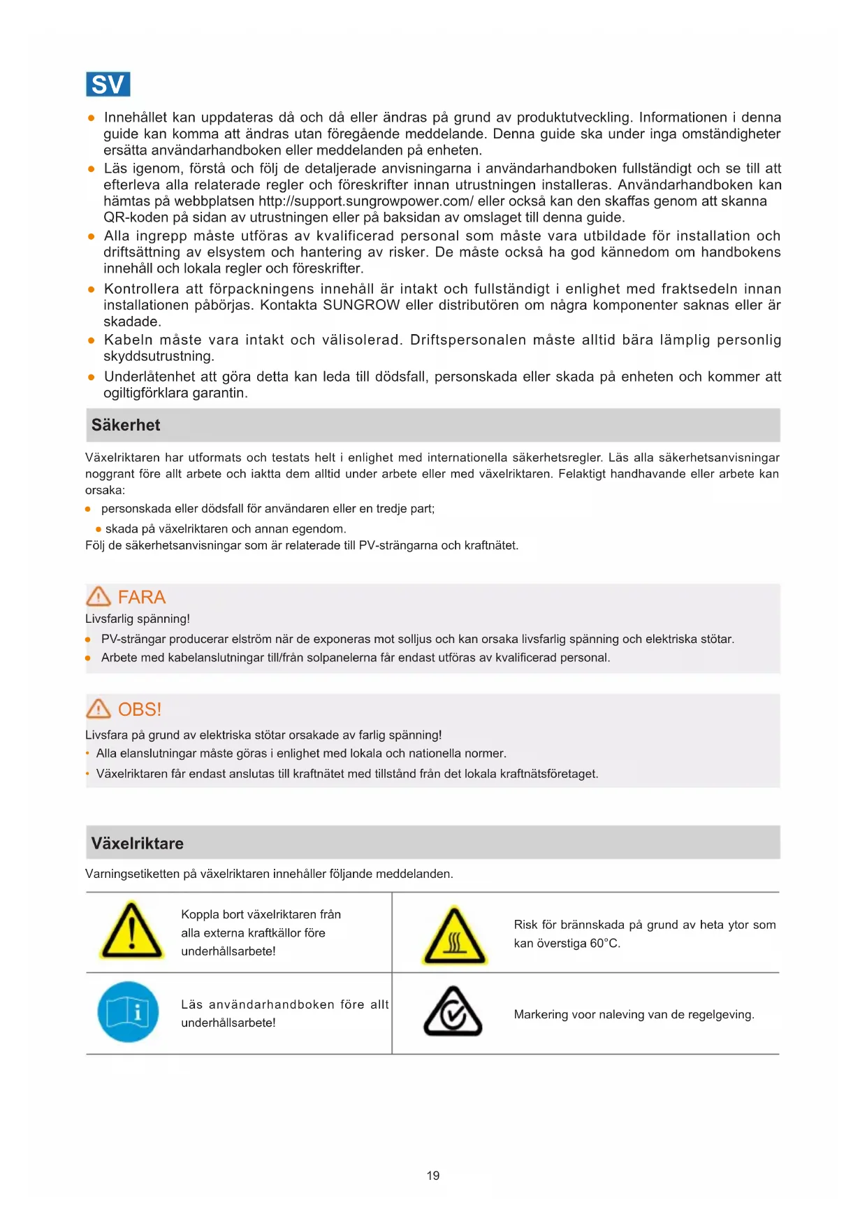 ● Innehållet kan uppdateras då och då eller ändras på grund av produktutveckling. Informationen i denna guide kan komma att ändras utan föregående meddelande. Denna guide ska under inga omständigheter ersätta användarhandboken eller meddelanden på enheten. ● Läs igenom, förstå och följ de detaljerade anvisningarna i användarhandboken fullständigt och se till att efterleva alla relaterade regler och föreskrifter innan utrustningen installeras. Användarhandboken kan hämtas på webbplatsen http://support.sungrowpower.com/ eller också kan den skaas genom att skanna QR-koden på sidan av utrustningen eller på baksidan av omslaget till denna guide. ● Alla ingrepp måste utföras av kvalificerad personal som måste vara utbildade för installation och driftsättning av elsystem och hantering av risker. De måste också ha god kännedom om handbokens innehåll och lokala regler och föreskrifter. ● Kontrollera att förpackningens innehåll är intakt och fullständigt i enlighet med fraktsedeln innan installationen påbörjas. Kontakta SUNGROW eller distributören om några komponenter saknas eller är skadade. ● Kabeln måste vara intakt och välisolerad. Driftspersonalen måste alltid bära lämplig personlig skyddsutrustning. ● Underlåtenhet att göra detta kan leda till dödsfall, personskada eller skada på enheten och kommer att ogiltigförklara garantin. Säkerhet Växelriktaren har utformats och testats helt i enlighet med internationella säkerhetsregler. Läs alla säkerhetsanvisningar noggrant före allt arbete och iaktta dem alltid under arbete eller med växelriktaren. Felaktigt handhavande eller arbete kan orsaka: ● personskada eller dödsfall för användaren eller en tredje part; ● skada på växelriktaren och annan egendom. Följ de säkerhetsanvisningar som är relaterade till PV-strängarna och kraftnätet. FARA Livsfarlig spänning! ● PV-strängar producerar elström när de exponeras mot solljus och kan orsaka livsfarlig spänning och elektriska stötar. ● Arbete med kabelanslutningar till/från solpanelerna får endast utföras av kvalicerad personal. OBS! Livsfara på grund av elektriska stötar orsakade av farlig spänning!