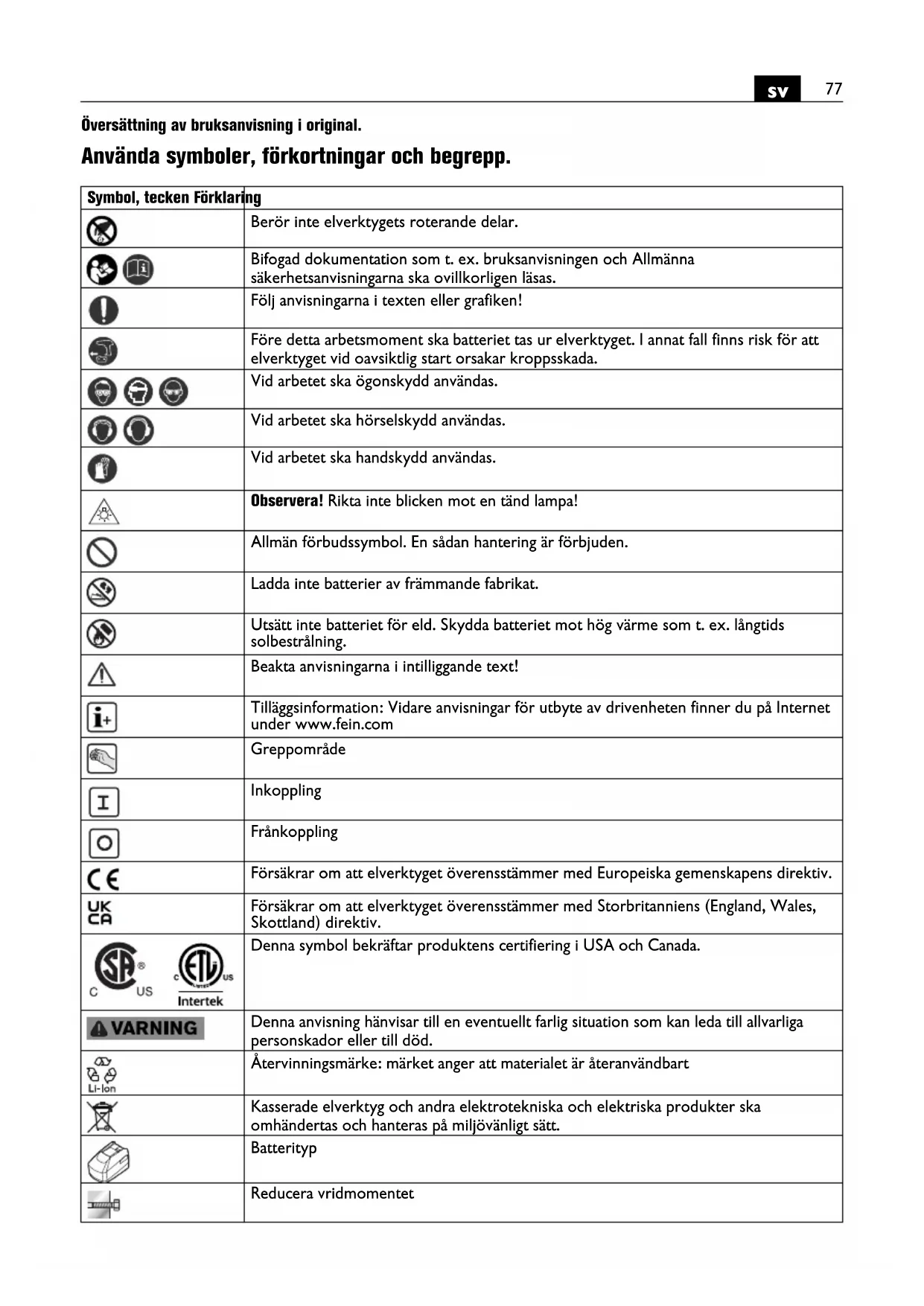 Översättning av bruksanvisning i original. Använda symboler, förkortningar och begrepp. Symbol, tecken Förklaring Berör inte elverktygets roterande delar. Bifogad dokumentation som t. ex. bruksanvisningen och Allmänna säkerhetsanvisningarna ska ovillkorligen läsas. Följ anvisningarna i texten eller grafiken! Före detta arbetsmoment ska batteriet tas ur elverktyget. I annat fall finns risk för att elverktyget vid oavsiktlig start orsakar kroppsskada. Vid arbetet ska ögonskydd användas. Vid arbetet ska hörselskydd användas. Vid arbetet ska handskydd användas. Observera! Rikta inte blicken mot en tänd lampa! Allmän förbudssymbol. En sådan hantering är förbjuden. Ladda inte batterier av främmande fabrikat. Utsätt inte batteriet för eld. Skydda batteriet mot hög värme som t. ex. långtids solbestrålning. Beakta anvisningarna i intilliggande text! Tilläggsinformation: Vidare anvisningar för utbyte av drivenheten finner du på Internet under www.fein.com Greppområde Inkoppling Frånkoppling Försäkrar om att elverktyget överensstämmer med Europeiska gemenskapens direktiv. Försäkrar om att elverktyget överensstämmer med Storbritanniens (England, Wales, Skottland) direktiv. Denna symbol bekräftar produktens certifiering i USA och Canada. Denna anvisning hänvisar till en eventuellt farlig situation som kan leda till allvarliga personskador eller till död. Återvinningsmärke: märket anger att materialet är återanvändbart Kasserade elverktyg och andra elektrotekniska och elektriska produkter ska omhändertas och hanteras på miljövänligt sätt. Batterityp Reducera vridmomentet78