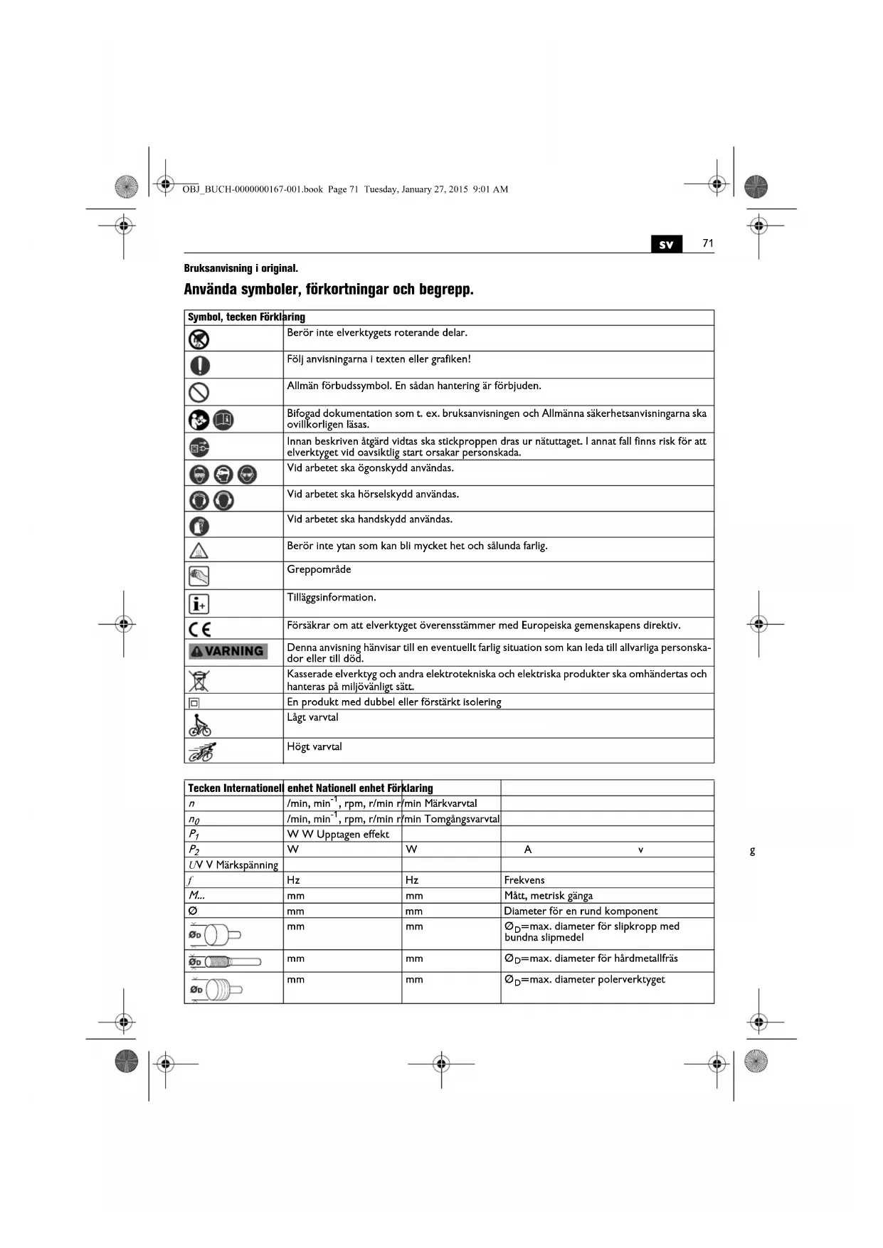 Bruksanvisning i original. Använda symboler, förkortningar och begrepp. Symbol, tecken Förklaring Berör inte elverktygets roterande delar. Följ anvisningarna i texten eller grafiken! Allmän förbudssymbol. En sådan hantering är förbjuden. Bifogad dokumentation som t. ex. bruksanvisningen och Allmänna säkerhetsanvisningarna ska ovillkorligen läsas. Innan beskriven åtgärd vidtas ska stickproppen dras ur nätuttaget. I annat fall finns risk för att elverktyget vid oavsiktlig start orsakar personskada. Vid arbetet ska ögonskydd användas. Vid arbetet ska hörselskydd användas. Vid arbetet ska handskydd användas. Berör inte ytan som kan bli mycket het och sålunda farlig. Greppområde Tilläggsinformation. Försäkrar om att elverktyget överensstämmer med Europeiska gemenskapens direktiv. Denna anvisning hänvisar till en eventuellt farlig situation som kan leda till allvarliga personska- dor eller till död. Kasserade elverktyg och andra elektrotekniska och elektriska produkter ska omhändertas och hanteras på miljövänligt sätt. En produkt med dubbel eller förstärkt isolering Lågt varvtal Högt varvtal Tecken Internationell enhet Nationell enhet Förklaring