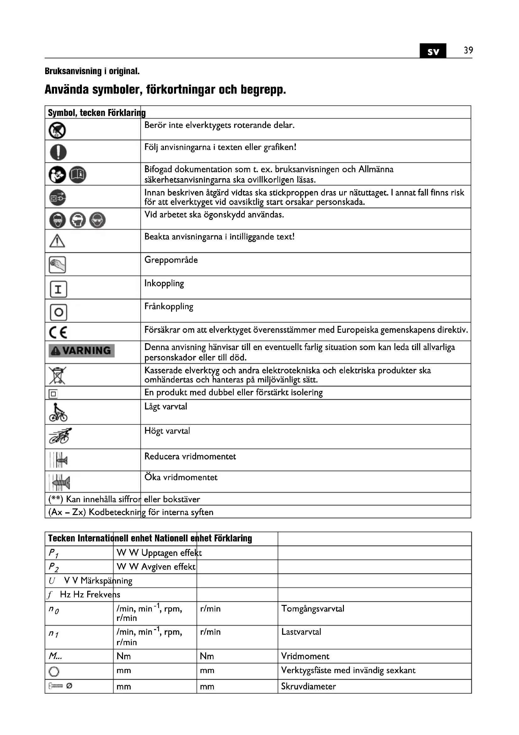 Bruksanvisning i original. Använda symboler, förkortningar och begrepp. Symbol, tecken Förklaring Berör inte elverktygets roterande delar. Följ anvisningarna i texten eller grafiken! Bifogad dokumentation som t. ex. bruksanvisningen och Allmänna säkerhetsanvisningarna ska ovillkorligen läsas. Innan beskriven åtgärd vidtas ska stickproppen dras ur nätuttaget. I annat fall finns risk för att elverktyget vid oavsiktlig start orsakar personskada. Vid arbetet ska ögonskydd användas. Beakta anvisningarna i intilliggande text! Greppområde Inkoppling Frånkoppling Försäkrar om att elverktyget överensstämmer med Europeiska gemenskapens direktiv. Denna anvisning hänvisar till en eventuellt farlig situation som kan leda till allvarliga personskador eller till död. Kasserade elverktyg och andra elektrotekniska och elektriska produkter ska omhändertas och hanteras på miljövänligt sätt. En produkt med dubbel eller förstärkt isolering Lågt varvtal Högt varvtal Reducera vridmomentet Öka vridmomentet (**) Kan innehålla siffror eller bokstäver (Ax – Zx) Kodbeteckning för interna syften Tecken Internationell enhet Nationell enhet Förklaring