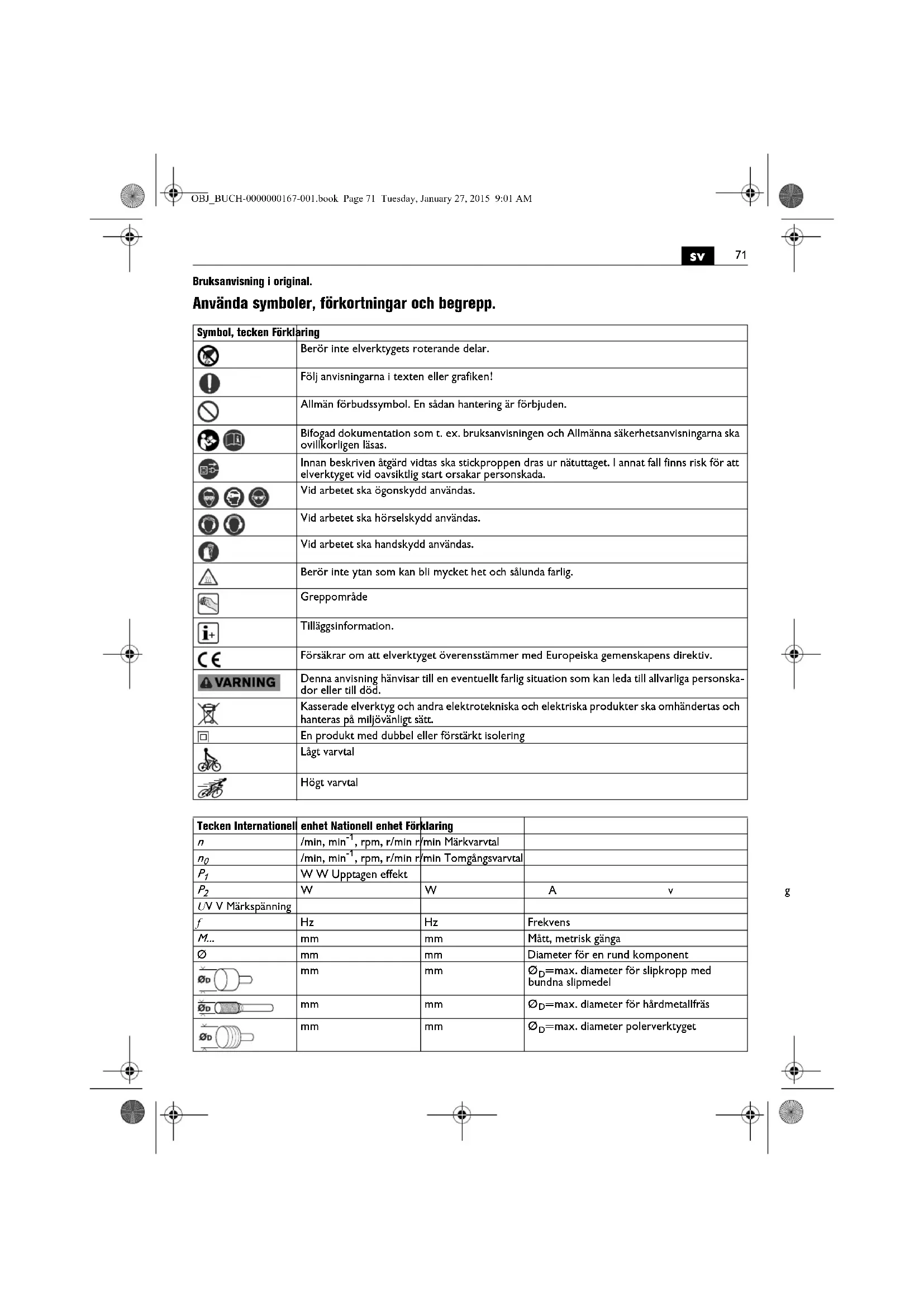 Bruksanvisning i original. Använda symboler, förkortningar och begrepp. Symbol, tecken Förklaring Berör inte elverktygets roterande delar. Följ anvisningarna i texten eller grafiken! Allmän förbudssymbol. En sådan hantering är förbjuden. Bifogad dokumentation som t. ex. bruksanvisningen och Allmänna säkerhetsanvisningarna ska ovillkorligen läsas. Innan beskriven åtgärd vidtas ska stickproppen dras ur nätuttaget. I annat fall finns risk för att elverktyget vid oavsiktlig start orsakar personskada. Vid arbetet ska ögonskydd användas. Vid arbetet ska hörselskydd användas. Vid arbetet ska handskydd användas. Berör inte ytan som kan bli mycket het och sålunda farlig. Greppområde Tilläggsinformation. Försäkrar om att elverktyget överensstämmer med Europeiska gemenskapens direktiv. Denna anvisning hänvisar till en eventuellt farlig situation som kan leda till allvarliga personska- dor eller till död. Kasserade elverktyg och andra elektrotekniska och elektriska produkter ska omhändertas och hanteras på miljövänligt sätt. En produkt med dubbel eller förstärkt isolering Lågt varvtal Högt varvtal Tecken Internationell enhet Nationell enhet Förklaring