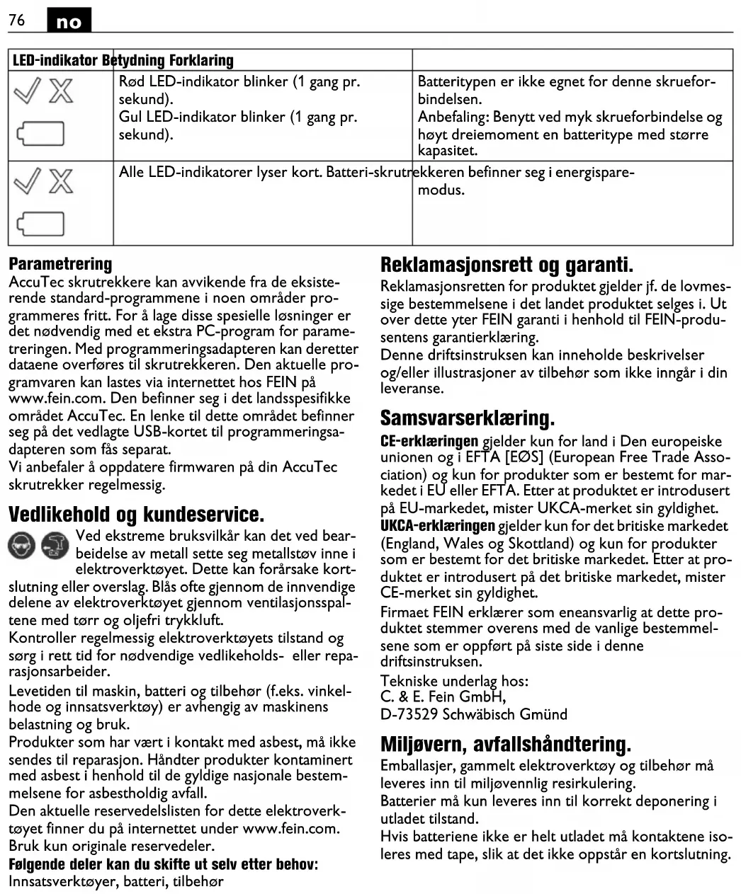 Parameterinställning På AccuTec skruvdragarna kan i avvikelse från förekom- mande standardprogram i vissa områden programmeras fritt. För att skapa dessa specialfunktioner krävs i tillägg ett PC-program för parameterinställning. Med pro- grammeringsadaptern kan data överföras till skruvdra- garen. Aktuellt program kan laddas ned via Internet hos FEIN på adress www.fein.com. Det hittas i landspecifika området för Accu-Tec. En länk till området finns på den separat tillhandahållna programmeringsadapterns bifo- gade USB-kort. Vi rekommenderar att AccuTec-skruvdragarens mjuka hårdvara regelbundet hålls i jour. Underhåll och kundservice. Vid bearbetning av metall kan under extrema betingelser ledande damm samlas i elverkty- gets inre. Renblås ofta elverktygets inre genom ventilationsöppningarna med torr och oljefri tryckluft. Utför en regelbunden tillståndskontroll på elverktyget och gör nödvändiga underhålls- och reparationsarbeten i tid. Maskinens, batteriets och tillbehörens (t ex vinkelhu- vud och insatsverktyg) livslängd är beroende av maski- nens belastning och användning. Produkter som varit i beröring med asbest får inte läm- nas till reparation. Disponera med asbest kontamine- rade produkter enligt landets gällande instruktioner för hantering av asbesthaltigt avfall. Den aktuella reservdelslistan för detta elverktyg hittar du i Internet på adress: www.fein.com. Använd endast originalreservdelar. Följande delar kan du vid behov själv byta ut: Insatsverktyg, batteri, tillbehör Garanti och tilläggsgaranti. Garanti lämnas på produkten enligt de lagbestämmelser som gäller i aktuellt användningsland. Dessutom lämnar FEIN en tilläggsgaranti enligt FEIN-tillverkargaranti- förklaring. Vid leverans av aktuellt elverktyg kan vissa delar saknas av de tillbehör som beskrivs eller visas i bruksanvis- ningen. Försäkran om överensstämmelse. CE-försäkran gäller endast för Europeiska unionens län- der och EFTA (European Free Trade Association) och endast för produkter som är avsedda för EU- eller EFTA-marknaden. Efter marknadsintroduktionen av produkten på EU-marknaden förlorar UKCA tecknet sin giltighet. UKCA-försäkran gäller endast för den brittiska markna- den (England, Wales och Skottland) och endast för pro- dukter som är avsedda för den brittiska marknaden. Efter marknadsintroduktionen av produkten på brit- tiska marknaden förlorar CE - tecknet sin giltighet. FEIN försäkrar under exklusivt ansvar att denna pro- dukt överensstämmer med de normativa dokument som anges på instruktionsbokens sista sida. Tekniska publikationer finns hos: C. & E. Fein GmbH, D-73529 Schwäbisch Gmünd Miljöskydd, avfallshantering. Förpackning, skrotade elverktyg och tillbehör ska han- teras på miljövänligt sätt. Avfallshantera batterier endast i urladdat tillstånd. Om batteriet inte är fullständigt urladdat, isolera stick- kontakten med tejp för att undvika kortslutning. Alla lysdioder blixtrar kort till. Den sladdlösa skruvdragaren kopplar om till energibesparing. LED-indikering Betydelse Förklaring82