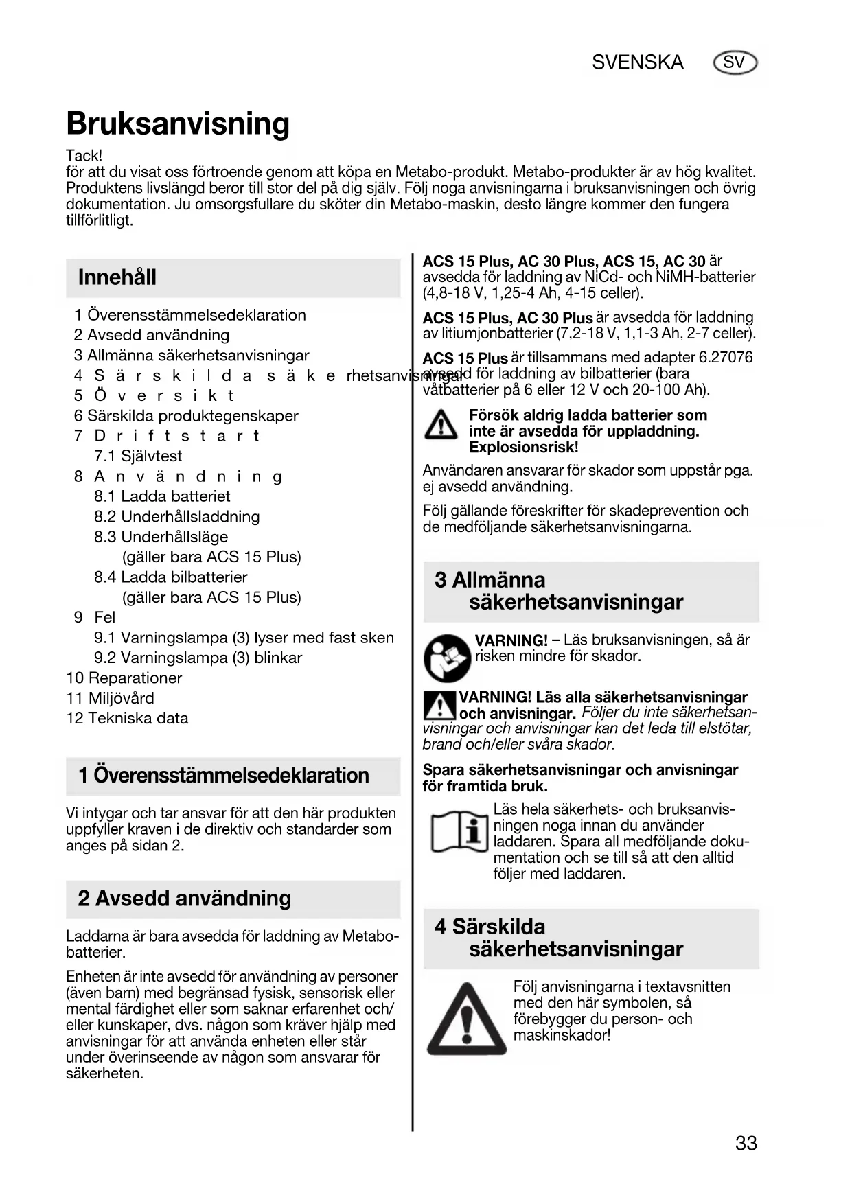 avsedda för laddning av NiCd- och NiMH-batterier (4,8-18 V, 1,25-4 Ah, 4-15 celler). ACS 15 Plus, AC 30 Plus är avsedda för laddning av litiumjonbatterier (7,2-18 V, 1,1-3 Ah, 2-7 celler). ACS 15 Plus är tillsammans med adapter 6.27076 avsedd för laddning av bilbatterier (bara våtbatterier på 6 eller 12 V och 20-100 Ah). Försök aldrig ladda batterier som inte är avsedda för uppladdning. Explosionsrisk! Användaren ansvarar för skador som uppstår pga. ej avsedd användning. Följ gällande föreskrifter för skadeprevention och de medföljande säkerhetsanvisningarna. VARNING! – Läs bruksanvisningen, så är risken mindre för skador. VARNING! Läs alla säkerhetsanvisningar och anvisningar. Följer du inte säkerhetsan- visningar och anvisningar kan det leda till elstötar, brand och/eller svåra skador. Spara säkerhetsanvisningar och anvisningar för framtida bruk. Läs hela säkerhets- och bruksanvis- ningen noga innan du använder laddaren. Spara all medföljande doku- mentation och se till så att den alltid följer med laddaren. Följ anvisningarna i textavsnitten med den här symbolen, så förebygger du person- och maskinskador! Bruksanvisning Tack! för att du visat oss förtroende genom att köpa en Metabo-produkt. Metabo-produkter är av hög kvalitet. Produktens livslängd beror till stor del på dig själv. Följ noga anvisningarna i bruksanvisningen och övrig dokumentation. Ju omsorgsfullare du sköter din Metabo-maskin, desto längre kommer den fungera tillförlitligt. Innehåll 1 Överensstämmelsedeklaration 2 Avsedd användning 3 Allmänna säkerhetsanvisningar 4 Särskilda säkerhetsanvisningar 17024963_0309 ACS 15 AC 30.book Seite 33 Mittwoch, 4. März 2009 4:29 1634 SVENSKA