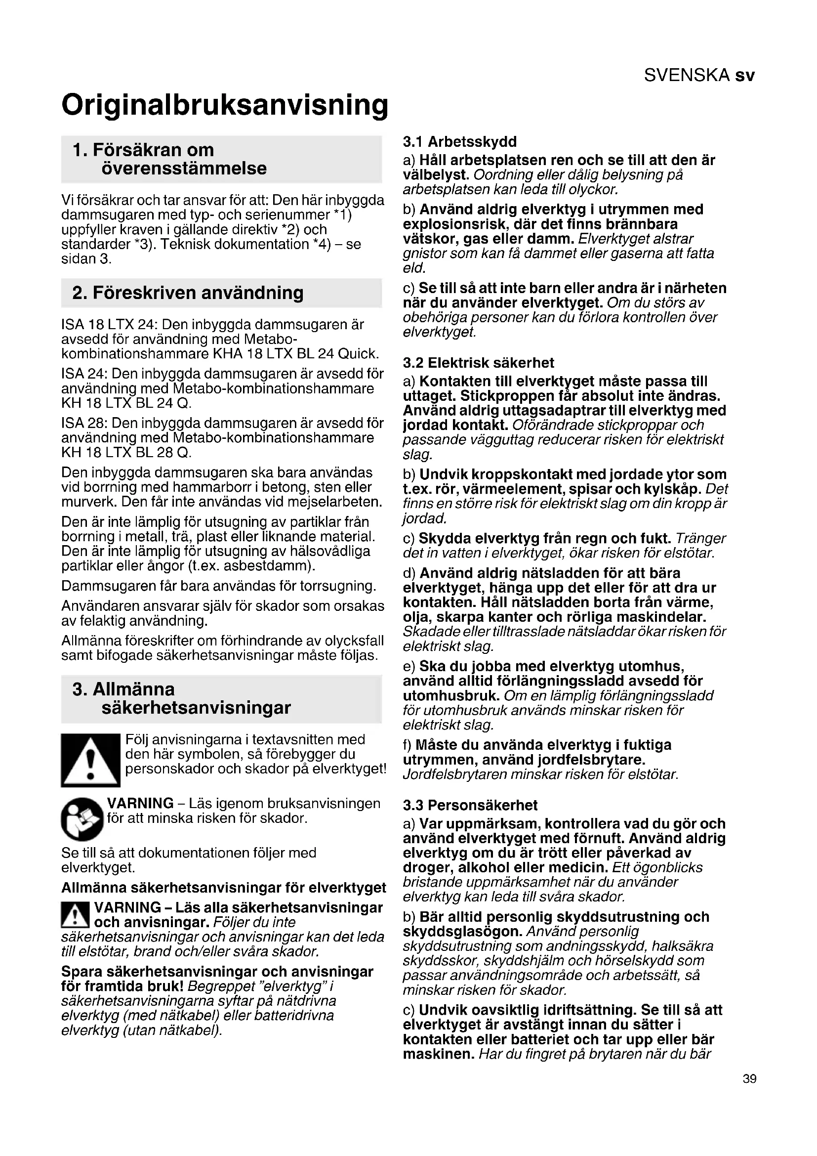 Originalbruksanvisning Vi försäkrar och tar ansvar för att: Den här inbyggda dammsugaren med typ- och serienummer *1) uppfyller kraven i gällande direktiv *2) och standarder *3). Teknisk dokumentation *4) – se sidan 3. ISA 18 LTX 24: Den inbyggda dammsugaren är avsedd för användning med Metabo- kombinationshammare KHA 18 LTX BL 24 Quick. ISA 24: Den inbyggda dammsugaren är avsedd för användning med Metabo-kombinationshammare KH 18 LTX BL 24 Q. ISA 28: Den inbyggda dammsugaren är avsedd för användning med Metabo-kombinationshammare KH 18 LTX BL 28 Q. Den inbyggda dammsugaren ska bara användas vid borrning med hammarborr i betong, sten eller murverk. Den får inte användas vid mejselarbeten. Den är inte lämplig för utsugning av partiklar från borrning i metall, trä, plast eller liknande material. Den är inte lämplig för utsugning av hälsovådliga partiklar eller ångor (t.ex. asbestdamm). Dammsugaren får bara användas för torrsugning. Användaren ansvarar själv för skador som orsakas av felaktig användning. Allmänna föreskrifter om förhindrande av olycksfall samt bifogade säkerhetsanvisningar måste följas. Följ anvisningarna i textavsnitten med den här symbolen, så förebygger du personskador och skador på elverktyget! VARNING – Läs igenom bruksanvisningen för att minska risken för skador. Se till så att dokumentationen följer med elverktyget. Allmänna säkerhetsanvisningar för elverktyget VARNING – Läs alla säkerhetsanvisningar och anvisningar. Följer du inte säkerhetsanvisningar och anvisningar kan det leda till elstötar, brand och/eller svåra skador. Spara säkerhetsanvisningar och anvisningar för framtida bruk! Begreppet ”elverktyg” i säkerhetsanvisningarna syftar på nätdrivna elverktyg (med nätkabel) eller batteridrivna elverktyg (utan nätkabel).