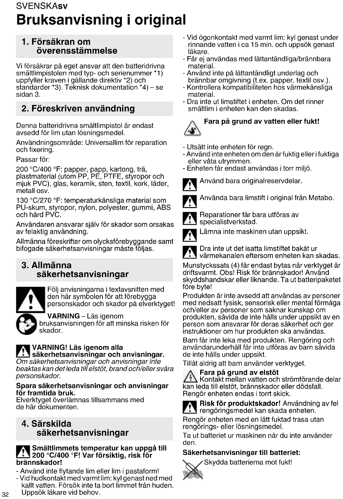 Bruksanvisning i original Vi försäkrar på eget ansvar att den batteridrivna smältlimpistolen med typ- och serienummer *1) uppfyller kraven i gällande direktiv *2) och standarder *3). Teknisk dokumentation *4) – se sidan 3. Denna batteridrivna smältlimpistol är endast avsedd för lim utan lösningsmedel. Användningsområde: Universallim för reparation och fixering. Passar för: 200 °C/400 °F: papper, papp, kartong, trä, plastmaterial (utom PP, PE, PTFE, styropor och mjuk PVC), glas, keramik, sten, textil, kork, läder, metall osv. 130 °C/270 °F: temperaturkänsliga material som PU-skum, styropor, nylon, polyester, gummi, ABS och hård PVC. Användaren ansvarar själv för skador som orsakas av felaktig användning. Allmänna föreskrifter om olycksförebyggande samt bifogade säkerhetsanvisningar måste följas. Följ anvisningarna i textavsnitten med den här symbolen för att förebygga personskador och skador på elverktyget! VARNING – Läs igenom bruksanvisningen för att minska risken för skador. VARNING! Läs igenom alla säkerhetsanvisningar och anvisningar. Om säkerhetsanvisningar och anvisningar inte beaktas kan det leda till elstöt, brand och/eller svåra personskador. Spara säkerhetsanvisningar och anvisningar för framtida bruk. Elverktyget överlämnas tillsammans med de här dokumenten. Smältlimmets temperatur kan uppgå till 200 °C/400 °F! Var försiktig, risk för brännskador! - Använd inte flytande lim eller lim i pastaform! - Vid hudkontakt med varmt lim: kyl genast ned med kallt vatten. Försök inte ta bort limmet från huden. Uppsök läkare vid behov. - Vid ögonkontakt med varmt lim: kyl genast under rinnande vatten i ca 15 min. och uppsök genast läkare. - Får ej användas med lättantändliga/brännbara material. - Använd inte på lättantändligt underlag och brännbar omgivning (t.ex. papper, textil osv.). - Kontrollera kompatibiliteten hos värmekänsliga material. - Dra inte ut limstiftet i enheten. Om det rinner smältlim i enheten kan den skadas. Fara på grund av vatten eller fukt! - Utsätt inte enheten för regn. - Använd inte enheten om den är fuktig eller i fuktiga eller våta utrymmen. - Enheten får endast användas i torr miljö. Använd bara originalreservdelar. Använda bara limstift i original från Metabo. Reparationer får bara utföras av specialistverkstad. Lämna inte maskinen utan uppsikt. Dra inte ut det isatta limstiftet bakåt ur värmekanalen eftersom enheten kan skadas. Munstyckssats (4) får endast bytas när verktyget är driftsvarmt. Obs! Risk för brännskador! Använd skyddshandskar eller liknande. Ta ut batteripaketet före byte! Produkten är inte avsedd att användas av personer med nedsatt fysisk, sensorisk eller mental förmåga och/eller av personer som saknar kunskap om produkten, såvida de inte hålls under uppsikt av en person som ansvarar för deras säkerhet och ger instruktioner om hur produkten ska användas. Barn får inte leka med produkten. Rengöring och användarunderhåll får inte utföras av barn såvida de inte hålls under uppsikt. Tillåt aldrig att barn använder verktyget. Fara på grund av elstöt Kontakt mellan vatten och strömförande delar kan leda till elstöt, brännskador eller dödsfall. Rengör enheten endas i torrt skick. Risk för produktskador! Användning av fel rengöringsmedel kan skada enheten. Rengör enheten med en lätt fuktad trasa utan rengörings- eller lösningsmedel. Ta ut batteriet ur maskinen när du inte använder den. Säkerhetsanvisningar till batteriet: Skydda batterierna mot fukt!