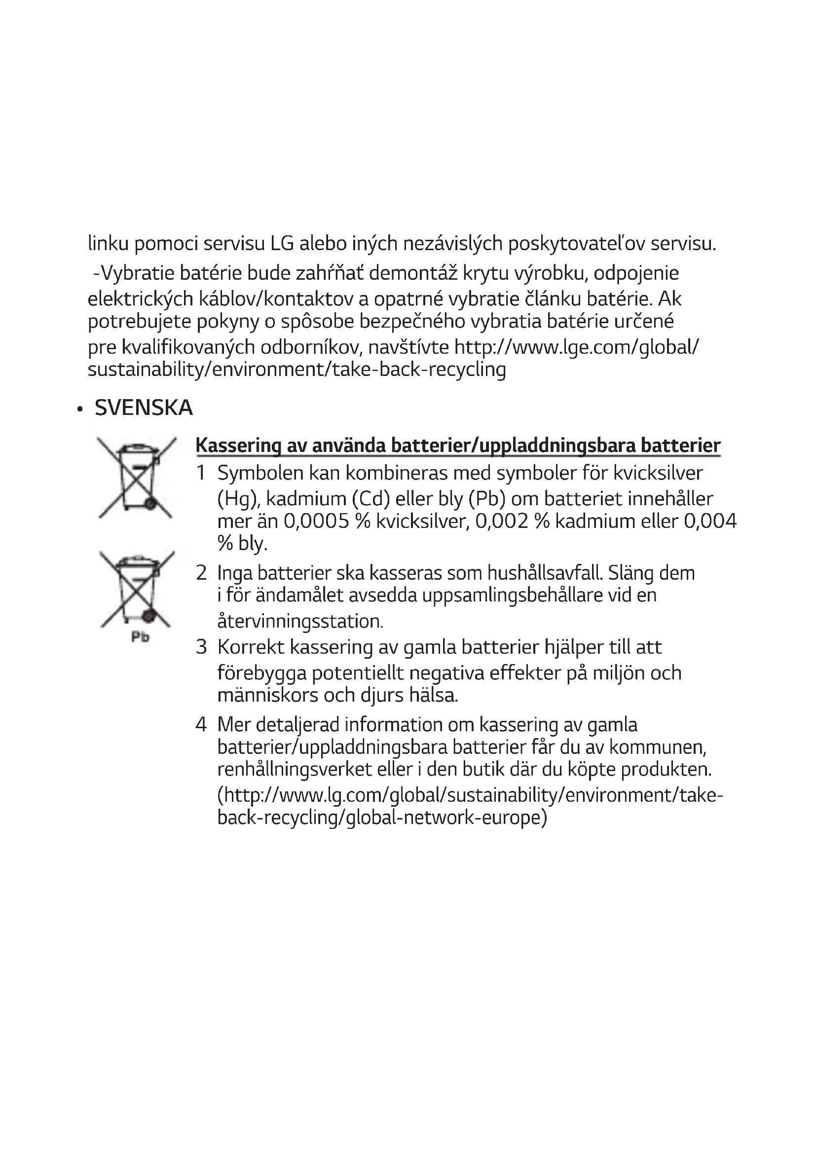 Mer detaljerad information om kassering av gamla batterier/uppladdningsbara batterier får du av kommunen, renhållningsverket eller i den butik där du köpte produkten. (http://www.lg.com/global/sustainability/environment/take- back-recycling/global-network-europe)Kassering av förbrukade batterier och ackumulatorer (Endast produkt med inbyggt batteri) -Om den här produkten innehåller ett batteri som sitter inbyggt i produkten och inte enkelt kan tas bort av användarna rekommenderar LG att endast behöriga personer tar ur batteriet, antingen för byte eller återvinning i slutet av produktens livslängd. För att förhindra skada på produkten och av säkerhetsskäl får användarna inte försöka ta ur batteriet och ska kontakta LG Service Helpline, eller en annan oberoende tjänsteleverantör för att få hjälp. -För att ta ut batteriet måste produktens chassi avlägsnas, elkablarna och kontakterna frånkopplas, varefter battericellen varsamt tas ut. Vid behov av instruktioner från behöriga fackmän kring hur batteriet avlägsnas på ett säkert sätt, besök sidan http://www.lge.com/global/sustainability/ environment/take-back-recycling