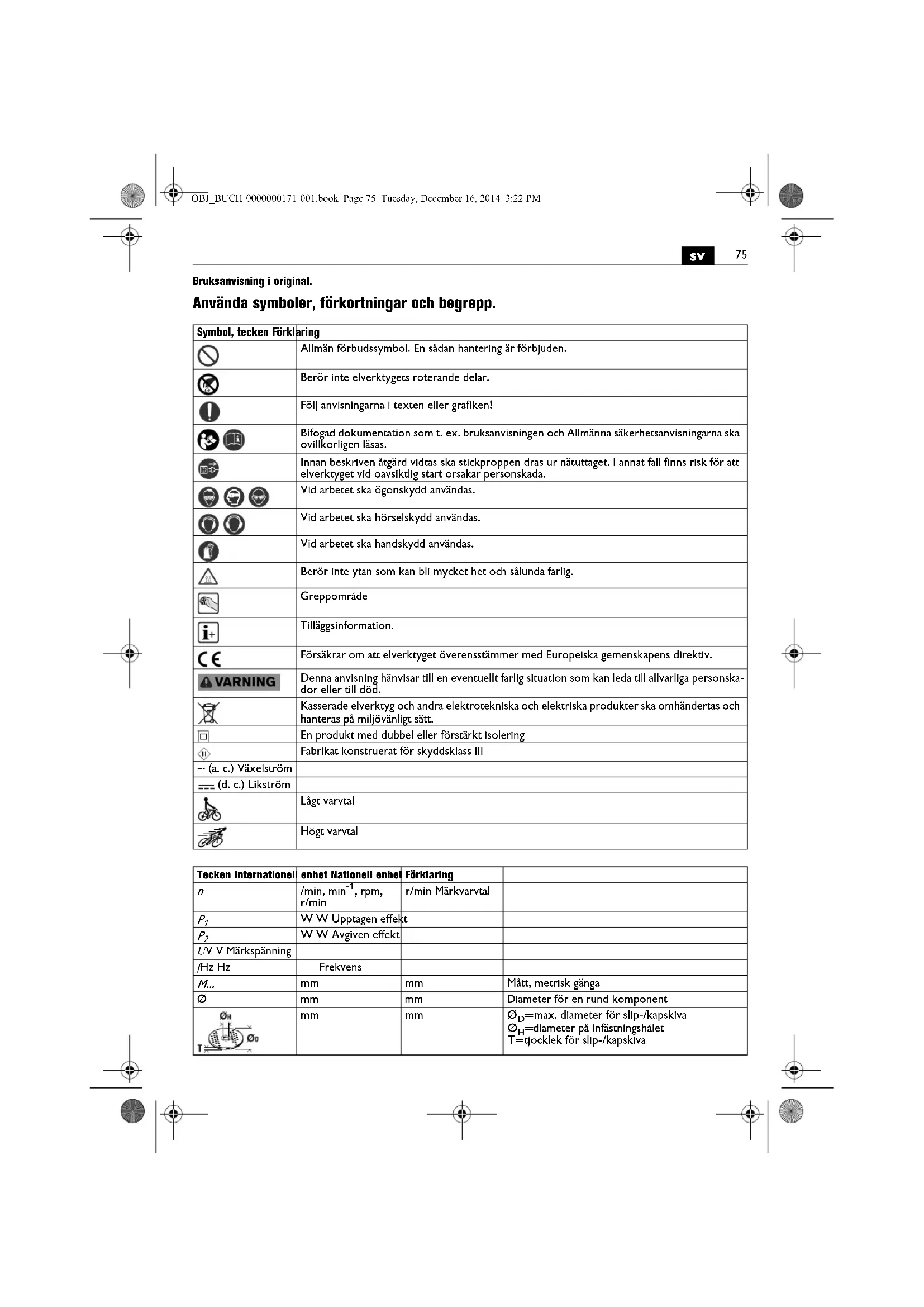 Bruksanvisning i original. Använda symboler, förkortningar och begrepp. Symbol, tecken Förklaring Allmän förbudssymbol. En sådan hantering är förbjuden. Berör inte elverktygets roterande delar. Följ anvisningarna i texten eller grafiken! Bifogad dokumentation som t. ex. bruksanvisningen och Allmänna säkerhetsanvisningarna ska ovillkorligen läsas. Innan beskriven åtgärd vidtas ska stickproppen dras ur nätuttaget. I annat fall finns risk för att elverktyget vid oavsiktlig start orsakar personskada. Vid arbetet ska ögonskydd användas. Vid arbetet ska hörselskydd användas. Vid arbetet ska handskydd användas. Berör inte ytan som kan bli mycket het och sålunda farlig. Greppområde Tilläggsinformation. Försäkrar om att elverktyget överensstämmer med Europeiska gemenskapens direktiv. Denna anvisning hänvisar till en eventuellt farlig situation som kan leda till allvarliga personska- dor eller till död. Kasserade elverktyg och andra elektrotekniska och elektriska produkter ska omhändertas och hanteras på miljövänligt sätt. En produkt med dubbel eller förstärkt isolering Fabrikat konstruerat för skyddsklass III ~ (a. c.) Växelström (d. c.) Likström Lågt varvtal Högt varvtal Tecken Internationell enhet Nationell enhet Förklaring