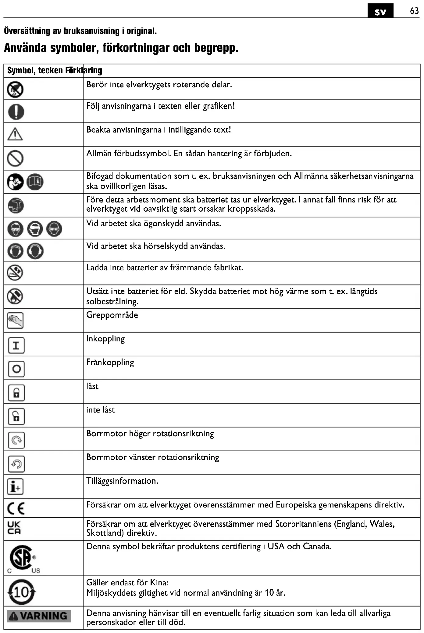 Översättning av bruksanvisning i original. Använda symboler, förkortningar och begrepp. Symbol, tecken Förklaring Berör inte elverktygets roterande delar. Följ anvisningarna i texten eller grafiken! Beakta anvisningarna i intilliggande text! Allmän förbudssymbol. En sådan hantering är förbjuden. Bifogad dokumentation som t. ex. bruksanvisningen och Allmänna säkerhetsanvisningarna ska ovillkorligen läsas. Före detta arbetsmoment ska batteriet tas ur elverktyget. I annat fall finns risk för att elverktyget vid oavsiktlig start orsakar kroppsskada. Vid arbetet ska ögonskydd användas. Vid arbetet ska hörselskydd användas. Ladda inte batterier av främmande fabrikat. Utsätt inte batteriet för eld. Skydda batteriet mot hög värme som t. ex. långtids solbestrålning. Greppområde Inkoppling Frånkoppling låst inte låst Borrmotor höger rotationsriktning Borrmotor vänster rotationsriktning Tilläggsinformation. Försäkrar om att elverktyget överensstämmer med Europeiska gemenskapens direktiv. Försäkrar om att elverktyget överensstämmer med Storbritanniens (England, Wales, Skottland) direktiv. Denna symbol bekräftar produktens certifiering i USA och Canada. Gäller endast för Kina: Miljöskyddets giltighet vid normal användning är 10 år. Denna anvisning hänvisar till en eventuellt farlig situation som kan leda till allvarliga personskador eller till död.64