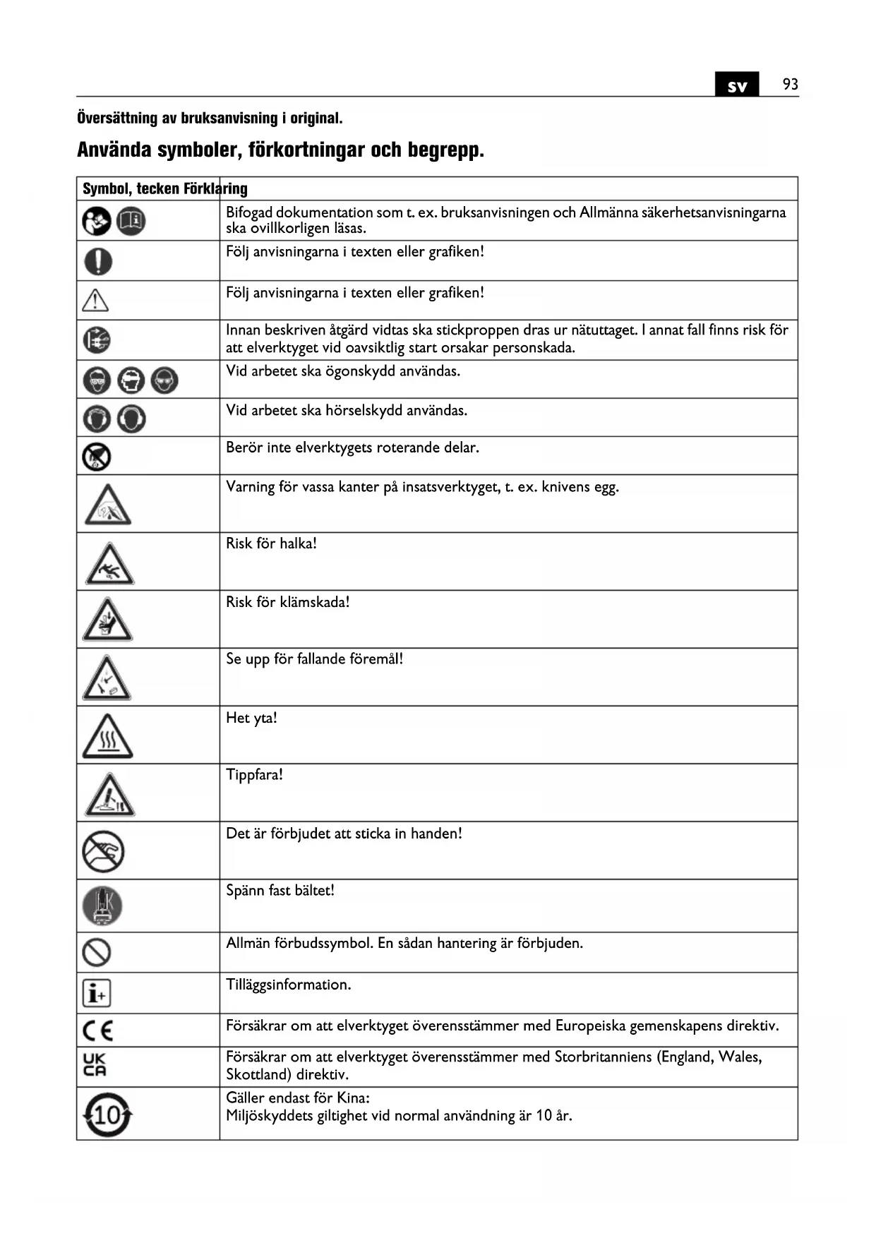 Översättning av bruksanvisning i original. Använda symboler, förkortningar och begrepp. Symbol, tecken Förklaring Bifogad dokumentation som t. ex. bruksanvisningen och Allmänna säkerhetsanvisningarna ska ovillkorligen läsas. Följ anvisningarna i texten eller grafiken! Följ anvisningarna i texten eller grafiken! Innan beskriven åtgärd vidtas ska stickproppen dras ur nätuttaget. I annat fall finns risk för att elverktyget vid oavsiktlig start orsakar personskada. Vid arbetet ska ögonskydd användas. Vid arbetet ska hörselskydd användas. Berör inte elverktygets roterande delar. Varning för vassa kanter på insatsverktyget, t. ex. knivens egg. Risk för halka! Risk för klämskada! Se upp för fallande föremål! Het yta! Tippfara! Det är förbjudet att sticka in handen! Spänn fast bältet! Allmän förbudssymbol. En sådan hantering är förbjuden. Tilläggsinformation. Försäkrar om att elverktyget överensstämmer med Europeiska gemenskapens direktiv. Försäkrar om att elverktyget överensstämmer med Storbritanniens (England, Wales, Skottland) direktiv. Gäller endast för Kina: Miljöskyddets giltighet vid normal användning är 10 år.94