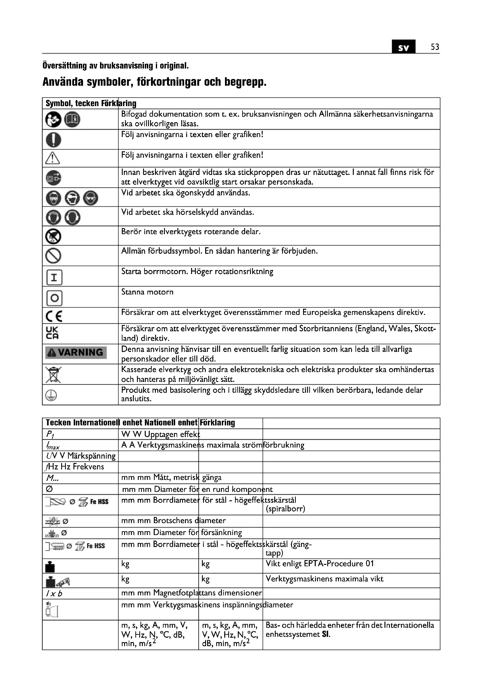 Översättning av bruksanvisning i original. Använda symboler, förkortningar och begrepp. Symbol, tecken Förklaring Bifogad dokumentation som t. ex. bruksanvisningen och Allmänna säkerhetsanvisningarna ska ovillkorligen läsas. Följ anvisningarna i texten eller grafiken! Följ anvisningarna i texten eller grafiken! Innan beskriven åtgärd vidtas ska stickproppen dras ur nätuttaget. I annat fall finns risk för att elverktyget vid oavsiktlig start orsakar personskada. Vid arbetet ska ögonskydd användas. Vid arbetet ska hörselskydd användas. Berör inte elverktygets roterande delar. Allmän förbudssymbol. En sådan hantering är förbjuden. Starta borrmotorn. Höger rotationsriktning Stanna motorn Försäkrar om att elverktyget överensstämmer med Europeiska gemenskapens direktiv. Försäkrar om att elverktyget överensstämmer med Storbritanniens (England, Wales, Skott- land) direktiv. Denna anvisning hänvisar till en eventuellt farlig situation som kan leda till allvarliga personskador eller till död. Kasserade elverktyg och andra elektrotekniska och elektriska produkter ska omhändertas och hanteras på miljövänligt sätt. Produkt med basisolering och i tillägg skyddsledare till vilken berörbara, ledande delar anslutits. Tecken Internationell enhet Nationell enhet Förklaring