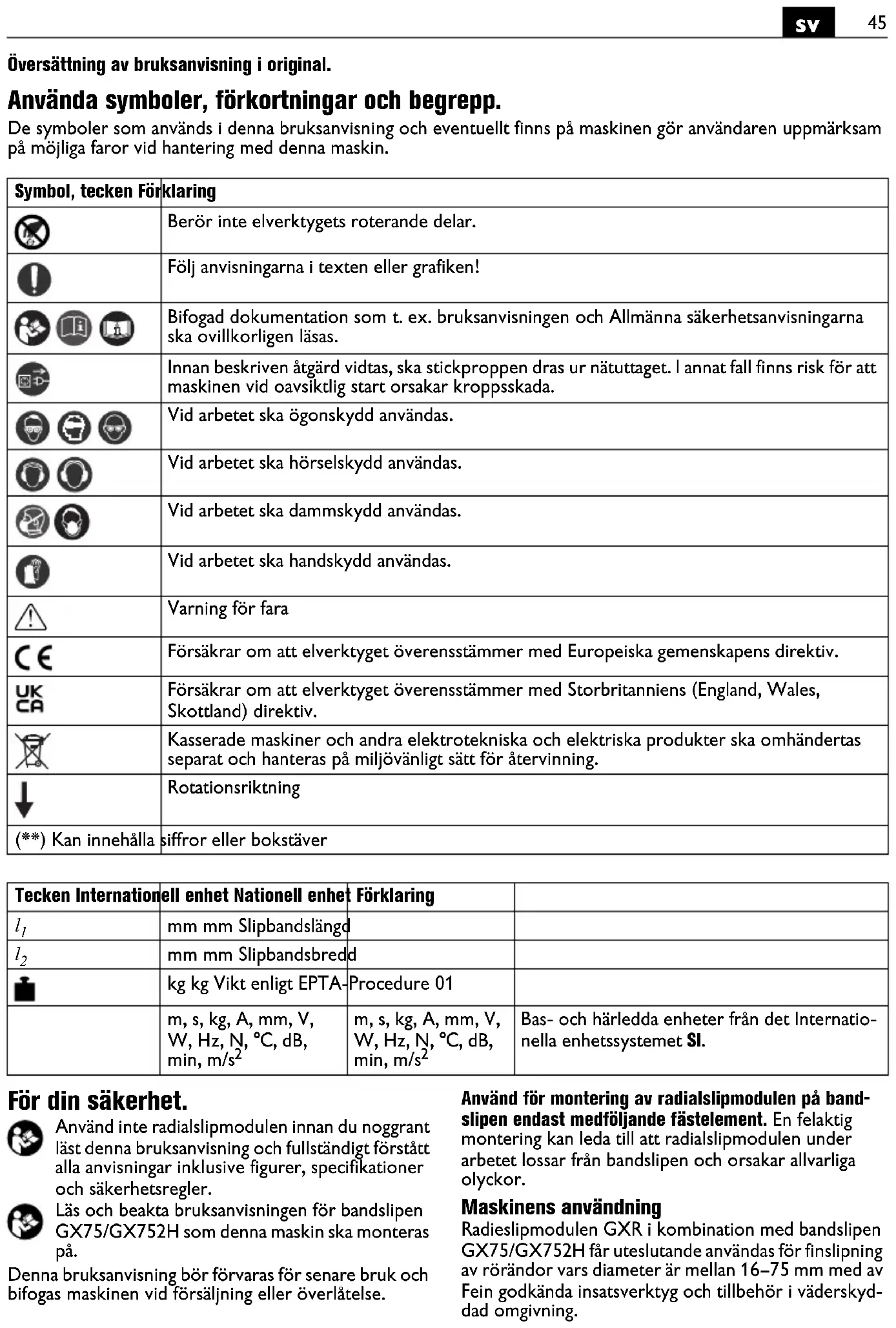 Läs och beakta bruksanvisingen für bandslipen GX75/GX752H somenna maskin skamonteras pa.