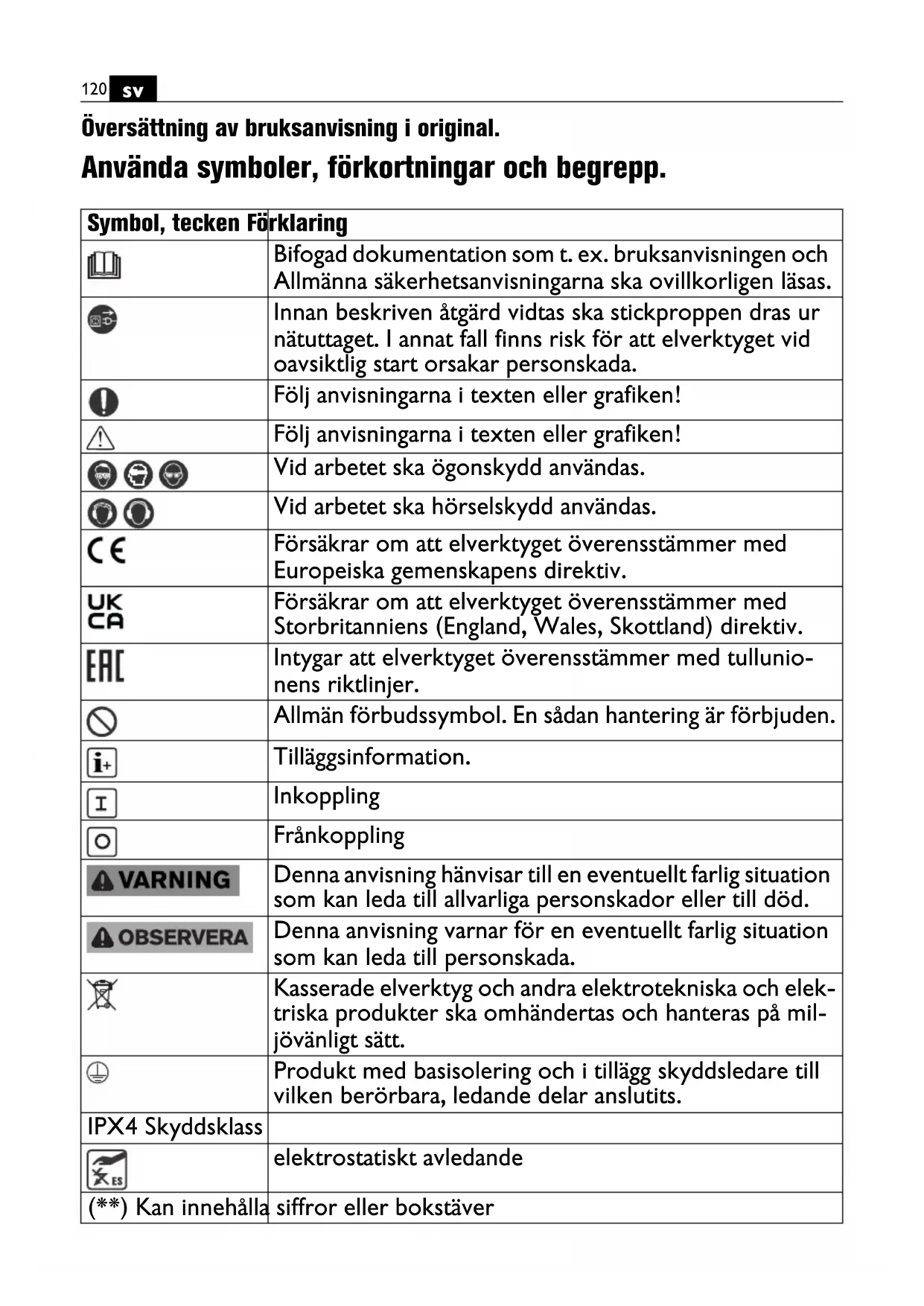 Översättning av bruksanvisning i original. Använda symboler, förkortningar och begrepp. Symbol, tecken Förklaring Bifogad dokumentation som t. ex. bruksanvisningen och Allmänna säkerhetsanvisningarna ska ovillkorligen läsas. Innan beskriven åtgärd vidtas ska stickproppen dras ur nätuttaget. I annat fall finns risk för att elverktyget vid oavsiktlig start orsakar personskada. Följ anvisningarna i texten eller grafiken! Följ anvisningarna i texten eller grafiken! Vid arbetet ska ögonskydd användas. Vid arbetet ska hörselskydd användas. Försäkrar om att elverktyget överensstämmer med Europeiska gemenskapens direktiv. Försäkrar om att elverktyget överensstämmer med Storbritanniens (England, Wales, Skottland) direktiv. Intygar att elverktyget överensstämmer med tullunio- nens riktlinjer. Allmän förbudssymbol. En sådan hantering är förbjuden. Tilläggsinformation. Inkoppling Frånkoppling Denna anvisning hänvisar till en eventuellt farlig situation som kan leda till allvarliga personskador eller till död. Denna anvisning varnar för en eventuellt farlig situation som kan leda till personskada. Kasserade elverktyg och andra elektrotekniska och elek- triska produkter ska omhändertas och hanteras på mil- jövänligt sätt. Produkt med basisolering och i tillägg skyddsledare till vilken berörbara, ledande delar anslutits. IPX4 Skyddsklass elektrostatiskt avledande (**) Kan innehålla siffror eller bokstäver121