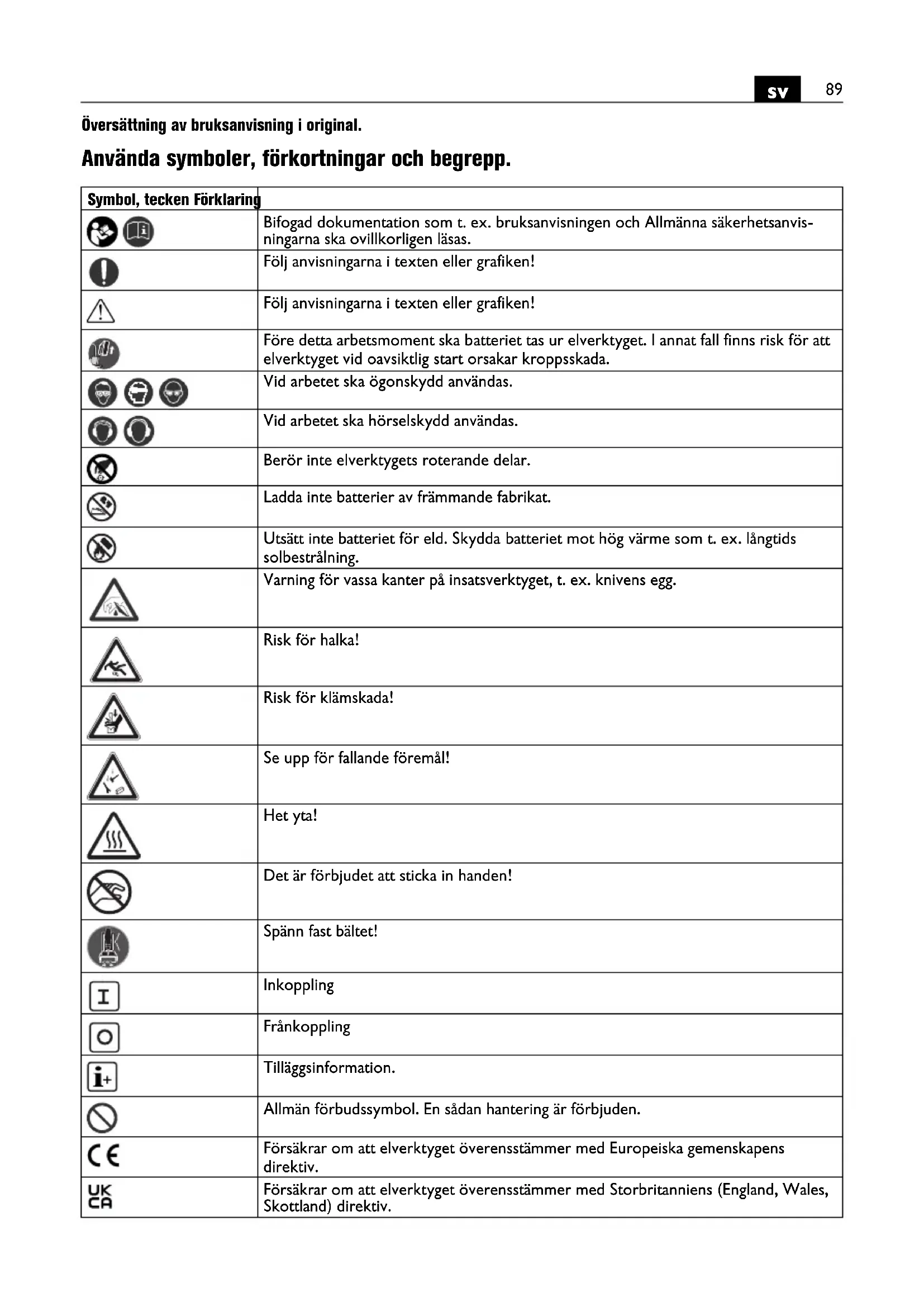 Översättning av bruksanvisning i original. Använda symboler, förkortningar och begrepp. Symbol, tecken Förklaring Bifogad dokumentation som t. ex. bruksanvisningen och Allmänna säkerhetsanvis- ningarna ska ovillkorligen läsas. Följ anvisningarna i texten eller grafiken! Följ anvisningarna i texten eller grafiken! Före detta arbetsmoment ska batteriet tas ur elverktyget. I annat fall finns risk för att elverktyget vid oavsiktlig start orsakar kroppsskada. Vid arbetet ska ögonskydd användas. Vid arbetet ska hörselskydd användas. Berör inte elverktygets roterande delar. Ladda inte batterier av främmande fabrikat. Utsätt inte batteriet för eld. Skydda batteriet mot hög värme som t. ex. långtids solbestrålning. Varning för vassa kanter på insatsverktyget, t. ex. knivens egg. Risk för halka! Risk för klämskada! Se upp för fallande föremål! Het yta! Det är förbjudet att sticka in handen! Spänn fast bältet! Inkoppling Frånkoppling Tilläggsinformation. Allmän förbudssymbol. En sådan hantering är förbjuden. Försäkrar om att elverktyget överensstämmer med Europeiska gemenskapens direktiv. Försäkrar om att elverktyget överensstämmer med Storbritanniens (England, Wales, Skottland) direktiv.90