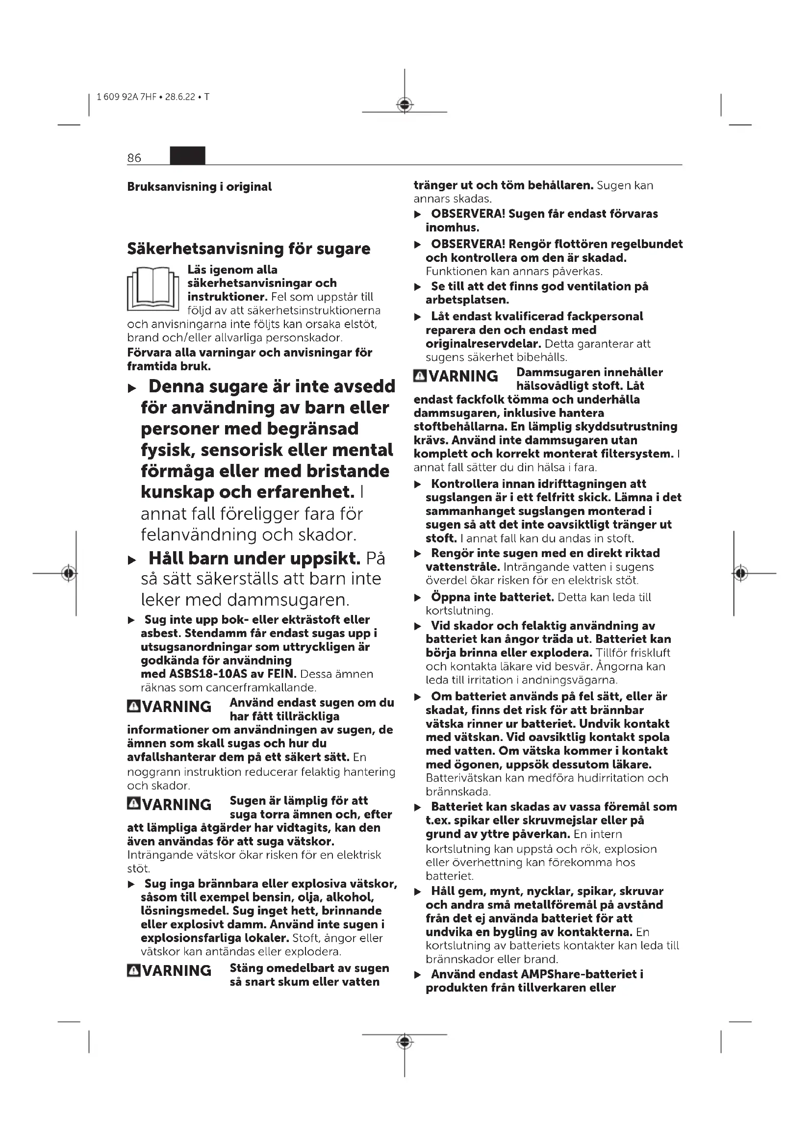 MontageSvensk u Ta bort batteriet innan du utför underhåll på sugen eller rengör den, utför inställningar, byter tillbehör eller förvarar den. Denna skyddsåtgärd förhindrar oavsiktlig start av dammsugaren. Batteriets laddningSvensk u Använd endast de laddare som anges i tekniska data. Endast dessa laddare är anpassade till det lithiumjon-batteri som används på din sug. Observera: litiumjonbatterier levereras delvis laddade enligt internationella transportföreskrifter. För full effekt ska batteriet laddas helt innan första användningen. u Undvik att trycka på på-/av-knappen efter en automatisk avstängning av dammsugare. Batteriet kan skadas. Är brukstiden efter uppladdning onormalt kort tyder det på att batterierna är förbrukade och måste bytas mot nya. Beakta anvisningarna för avfallshantering. 88 sv 1 609 92A 7HF • 28.6.22 • TBatteristatusindikatorSvensk När batteriet är isatt kan du se batteriets laddningsnivå på batteristatusindikatorn(4) på dammsugaren, när batteriet tagits ut kan du se det på själva batteriet. Batteristatusindikator på dammsugarenSvensk Efter att dammsugaren satts på tänds fem gröna LED-lampor på batteristatusindikatorn(4) enskilt stigande och fallande. Därefter visar LED:erna batteriets(19) laddningsstatus. Batteristatusindikator på batterietSvensk Om batteriet tas ut ur dammsugaren kan laddningsnivån visas via de gröna LED-lamporna på batteriet. Tryck på knappen för indikering av batteristatus eller för att visa batteriets laddningsnivå. Om ingen LED-lampa lyser efter ett tryck på knappen för batteristatus är batteriet defekt och måste bytas ut. Batterityp GBA 18V...Svensk LED Kapacitet Fast ljus 3× grönt 60−100% Fast ljus 2× grönt 30−60% Fast ljus 1× grönt 5−30% Blinkande ljus 1× grön 0−5% Batterityp ProCORE18V...Svensk LED Kapacitet Fast ljus 5× grönt 80−100 % Fast ljus 4× grönt 60−80 % Fast ljus 3× grönt 40−60 % Fast ljus 2× grönt 20−40 % Fast ljus 1× grönt 5−20 % Blinkande ljus 1× grön 0−5 % Sätta in och ta ut batteriet (sebildA1−A2)Svensk u Använd inte våld när du sätter in batteriet. Batteriet är konstruerat så att det bara kan sättas in i produkten i korrekt position. u Håll batterifacket och batterischaktet rena och torra för bra och säkert arbete. – Tryck på upplåsningsknappen (10) för att öppna batterifackets lock (11). – Skjut in batteriet (19) i batterischaktet (18) tills det klickar fast hörbart. – För att ta ut batteriet (19), tryck på upplåsningsknappen (20) på batteriet och dra ut det ur batterischaktet (18). – Stäng batterirackets lock (11). Montera hållare för sugtillbehör (sebildB)Svensk – Skjut hållaren (21) för sugrör och fogmunstycke med kraft uppifrån i avsedd hållare (9), tills den klickar fast. – Skjut hållaren (23) för sugslangen och golvmunstycket uppifrån i avsedd hållare (7) och dra åt fästskruven (22). Montera sugslang (se bild C)Svensk – Sätt in sugslangen (12) i slanghållaren (8)tills de båda tryckknapparna (24) på sugslangen snäpper fast. Anmärkning: Vid dammsugning uppstår en elektrisk laddning genom friktion hos dammet i sugslangen och -tillbehöret, som användaren kan känna av i form av statisk urladdning (beroende på omgivningens påverkan och kroppslig uppfattning). Montera sugtillbehörSvensk Sugslangen (12) är utrustad med ett klämsystem med vilket sugtillbehöret (utsugsadapter (13), det böjda munstycket (14)) kan anslutas. Montera utsugsadaptern eller det böjda munstycket (sebildD)Svensk – Sätt utsugsadaptern (13) eller det böjda munstycket (14) på utsugsslangen (12), tills de båda knapparna (24) på utsugsslangen klickar fast hörbart. – För att demontera trycker du tryckknapparna (24) inåt och drar komponenterna åt sidan. Montera munstycken och rörSvensk – Sätt vid behov in sugrören (17) i varandra och därefter fast på det böjda munstycket (14). – Sätt in golvmunstycket (16) eller fogmunstycket (15) i sugröret (17) eller det böjda munstycket (14). Montera rullar (sebildE)Svensk Sätt de 4 fäststiften för rullarna(25) i rullarnas fästen(26) så att de snäpper fast hörbart. Även andra rullar kan användas enligt standard EN12529 (diameter fäststift 11mm). u Kontrollera rullbromsarnas funktionsduglighet innan du använder dammsugaren. DriftSvensk u Ta bort batteriet innan du utför underhåll på sugen eller rengör den, utför inställningar, byter tillbehör eller förvarar sv 89 1 609 92A 7HF • 28.6.22 • Tden. Denna skyddsåtgärd förhindrar oavsiktlig start av dammsugaren. u Se till att arbetsområdet är rent och prydligt på grund av snubbelrisk. DriftstartSvensk u Dammsugaren får inte användas utan filter. u Använd endast ett oskadat filter (inga revor, små hål etc.). Byt ut skadade filter omedelbart. u Kontrollera innan sugningen att filtret är fast monterat. u Innan dammsugning, se till att batterifackets lock är stängt. u Informera dig om de gällande bestämmelserna/lagarna beträffande hanteringen av hälsovådligt stoft i ditt land. Sugen får generellt inte användas i utrymmen där det finns risk för explosioner. För att garantera en optimal sugeffekt måste du alltid ta av dammsugarslangen(12) helt och hållet från hållaren(23). Slå på och stänga avSvensk För att slå på dammsugaren, tryck kort på på-/ av-knappen(3). För att stänga av dammsugaren, tryck på på-/ av-knappen(3) igen. Av säkerhetsskäl slås dammsugaren inte på om på-/av-knappen(3) trycks in längre än 5sek. TorrsugningSvensk Bortsugning av uppkommande damm från arbetande elverktyg (se bild F)Svensk u Det skall finnas ett tillräckligt luftväxlingsförhållande (L) i rummet när frånluften går tillbaka in i rummet. Beakta nationella föreskrifter. – Montera utsugsadaptern (13) eller det böjda munstycket (14) (se „Montera utsugsadaptern eller det böjda munstycket (sebildD)“, Sidan89). – Sätt in utsugsadaptern 