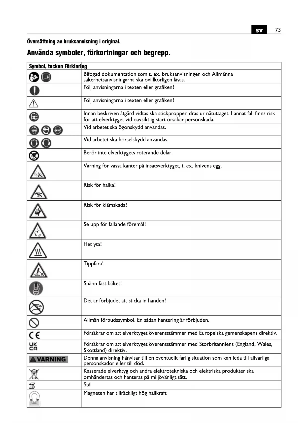 Översättning av bruksanvisning i original. Använda symboler, förkortningar och begrepp. Symbol, tecken Förklaring Bifogad dokumentation som t. ex. bruksanvisningen och Allmänna säkerhetsanvisningarna ska ovillkorligen läsas. Följ anvisningarna i texten eller grafiken! Följ anvisningarna i texten eller grafiken! Innan beskriven åtgärd vidtas ska stickproppen dras ur nätuttaget. I annat fall finns risk för att elverktyget vid oavsiktlig start orsakar personskada. Vid arbetet ska ögonskydd användas. Vid arbetet ska hörselskydd användas. Berör inte elverktygets roterande delar. Varning för vassa kanter på insatsverktyget, t. ex. knivens egg. Risk för halka! Risk för klämskada! Se upp för fallande föremål! Het yta! Tippfara! Spänn fast bältet! Det är förbjudet att sticka in handen! Allmän förbudssymbol. En sådan hantering är förbjuden. Försäkrar om att elverktyget överensstämmer med Europeiska gemenskapens direktiv. Försäkrar om att elverktyget överensstämmer med Storbritanniens (England, Wales, Skottland) direktiv. Denna anvisning hänvisar till en eventuellt farlig situation som kan leda till allvarliga personskador eller till död. Kasserade elverktyg och andra elektrotekniska och elektriska produkter ska omhändertas och hanteras på miljövänligt sätt. Stål Magneten har tillräckligt hög hållkraft74