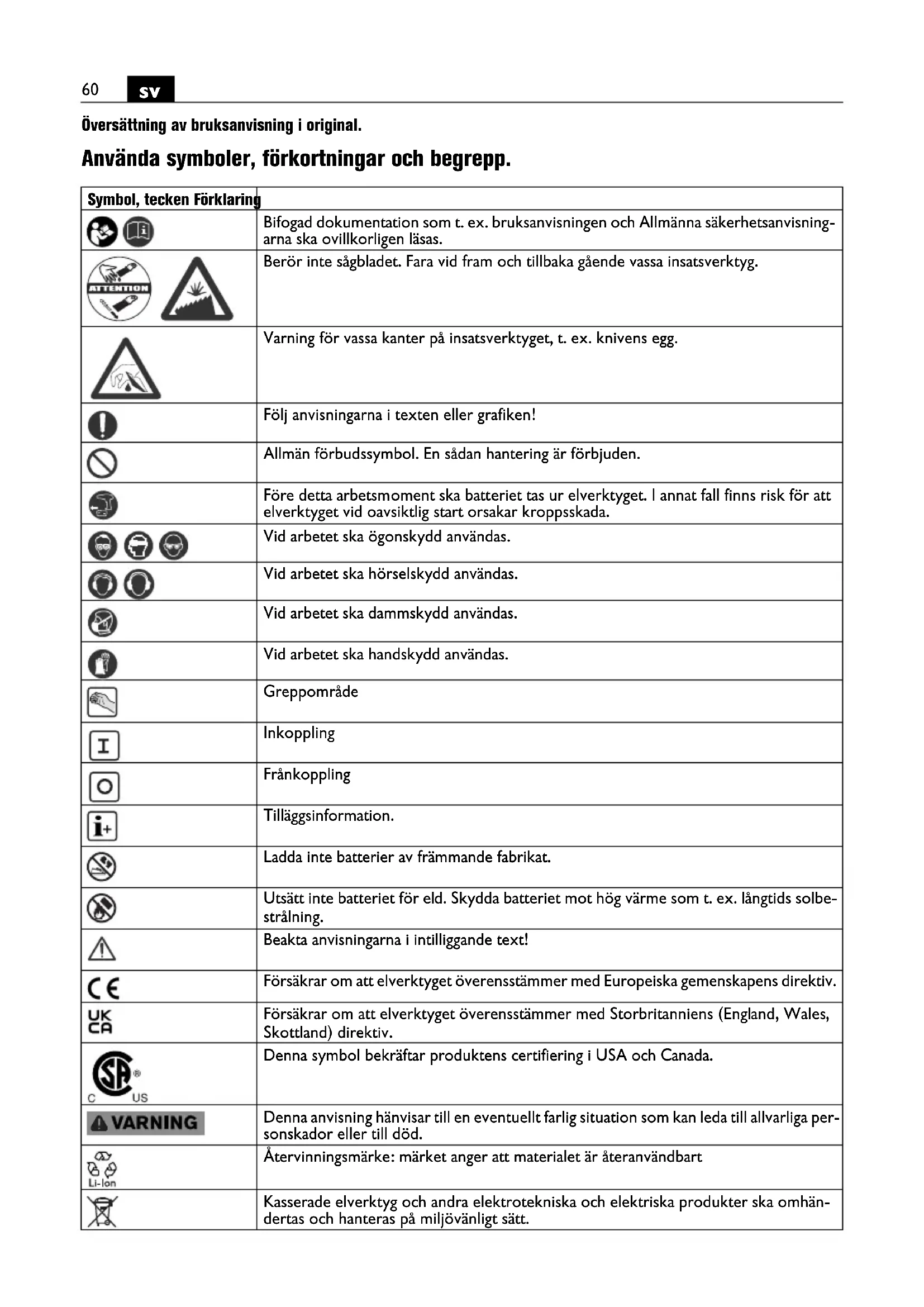Översättning av bruksanvisning i original. Använda symboler, förkortningar och begrepp. Symbol, tecken Förklaring Bifogad dokumentation som t. ex. bruksanvisningen och Allmänna säkerhetsanvisning- arna ska ovillkorligen läsas. Berör inte sågbladet. Fara vid fram och tillbaka gående vassa insatsverktyg. Varning för vassa kanter på insatsverktyget, t. ex. knivens egg. Följ anvisningarna i texten eller grafiken! Allmän förbudssymbol. En sådan hantering är förbjuden. Före detta arbetsmoment ska batteriet tas ur elverktyget. I annat fall finns risk för att elverktyget vid oavsiktlig start orsakar kroppsskada. Vid arbetet ska ögonskydd användas. Vid arbetet ska hörselskydd användas. Vid arbetet ska dammskydd användas. Vid arbetet ska handskydd användas. Greppområde Inkoppling Frånkoppling Tilläggsinformation. Ladda inte batterier av främmande fabrikat. Utsätt inte batteriet för eld. Skydda batteriet mot hög värme som t. ex. långtids solbe- strålning. Beakta anvisningarna i intilliggande text! Försäkrar om att elverktyget överensstämmer med Europeiska gemenskapens direktiv. Försäkrar om att elverktyget överensstämmer med Storbritanniens (England, Wales, Skottland) direktiv. Denna symbol bekräftar produktens certifiering i USA och Canada. Denna anvisning hänvisar till en eventuellt farlig situation som kan leda till allvarliga per- sonskador eller till död. Återvinningsmärke: märket anger att materialet är återanvändbart Kasserade elverktyg och andra elektrotekniska och elektriska produkter ska omhän- dertas och hanteras på miljövänligt sätt.61