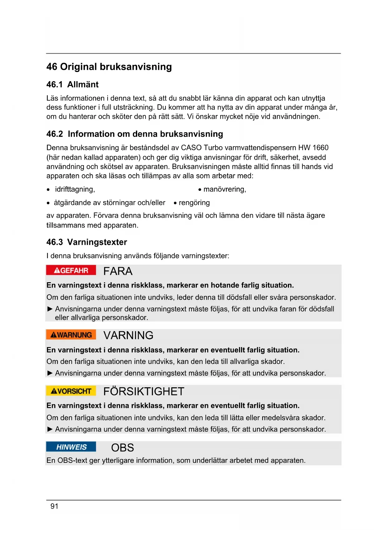 I denna bruksanvisning används följande varningstexter: FARA En varningstext i denna riskklass, markerar en hotande farlig situation. Om den farliga situationen inte undviks, leder denna till dödsfall eller svåra personskador. ► Anvisningarna under denna varningstext måste följas, för att undvika faran för dödsfall eller allvarliga personskador. VARNING En varningstext i denna riskklass, markerar en eventuellt farlig situation. Om den farliga situationen inte undviks, kan den leda till allvarliga skador. ► Anvisningarna under denna varningstext måste följas, för att undvika personskador. FÖRSIKTIGHET En varningstext i denna riskklass, markerar en eventuellt farlig situation. Om den farliga situationen inte undviks, kan den leda till lätta eller medelsvåra skador. ► Anvisningarna under denna varningstext måste följas, för att undvika personskador. OBS En OBS-text ger ytterligare information, som underlättar arbetet med apparaten.92