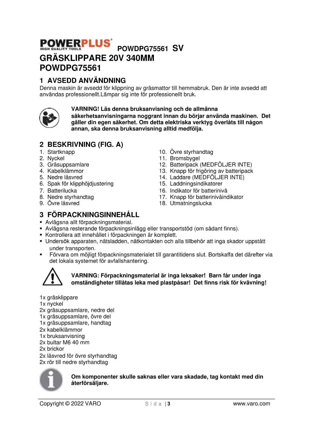 Då produkten tjänat ut får den inte lämnas med det vanliga hushållsavfallet utan ska deponeras på miljömässigt korrekt sätt och enligt gällande lokala bestämmelser. Avfall som kommer från elektriska maskinkomponenter får inte hanteras som vanligt hushållsavfall. De ska deponeras för återvinning där återvinningscentraler finns att tillgå. Kontakta lokala myndigheter eller din återförsäljare för närmare information om återvinning.POWDPG75561 FI Copyright © 2022 VARO S i v u | 1 www.varo.com