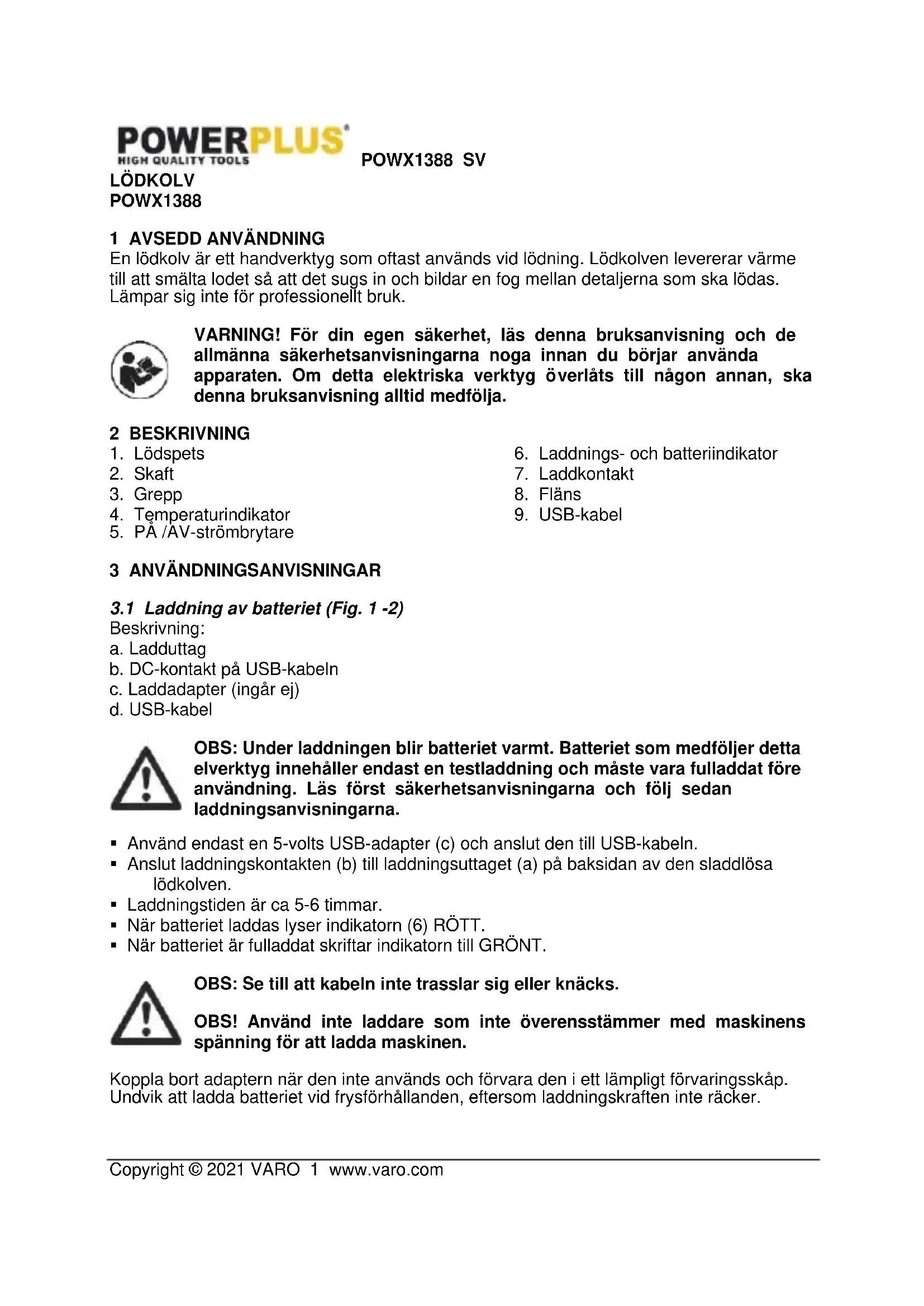 - När batteriet är fulladdat skriftar indikatorn till GRÖNT. OBS: Se till att kabeln inte trasslar sig eller knäcks. OBS! Använd inte laddare som inte överensstämmer med maskinens spänning för att ladda maskinen. Koppla bort adaptern när den inte används och förvara den i ett lämpligt förvaringsskåp. Undvik att ladda batteriet vid frysförhållanden, eftersom laddningskraften inte räcker.POWX1388 SV Copyright © 2021 VARO 2 www.varo.com OBS! Om verktyget inte kommer att användas under långa perioder ska batteriet laddas var tredje till sjätte månad OBS: För att förhindra skador på batteriet då det blir urladdat, ladda batteriet så att det är fullt eller inte mindre än hälften laddat innan det lagras.