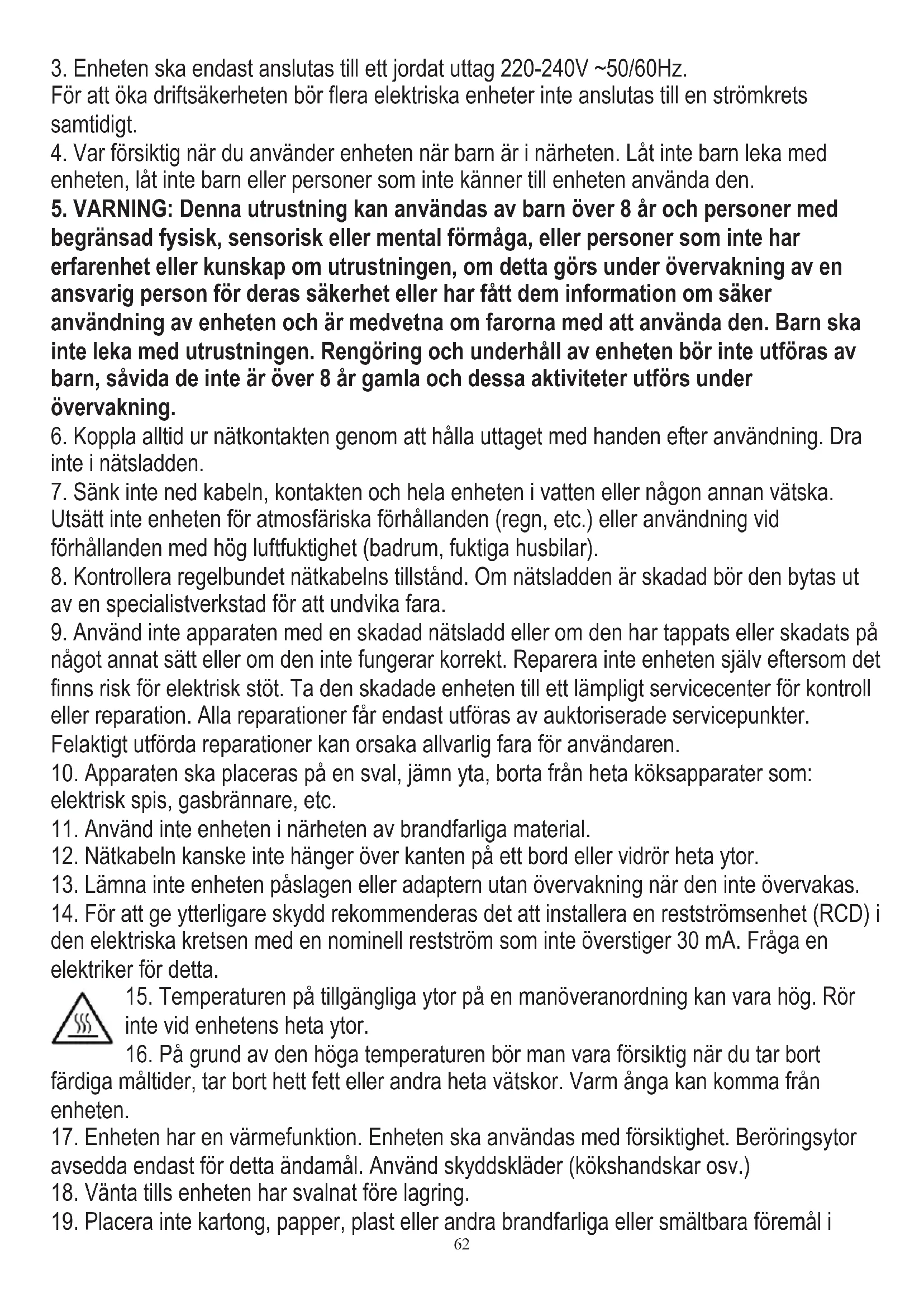 begränsad fysisk, sensorisk eller mental förmåga, eller personer som inte har erfarenhet eller kunskap om utrustningen, om detta görs under övervakning av en ansvarig person för deras säkerhet eller har fått dem information om säker användning av enheten och är medvetna om farorna med att använda den. Barn ska inte leka med utrustningen. Rengöring och underhåll av enheten bör inte utföras av barn, såvida de inte är över 8 år gamla och dessa aktiviteter utförs under övervakning.